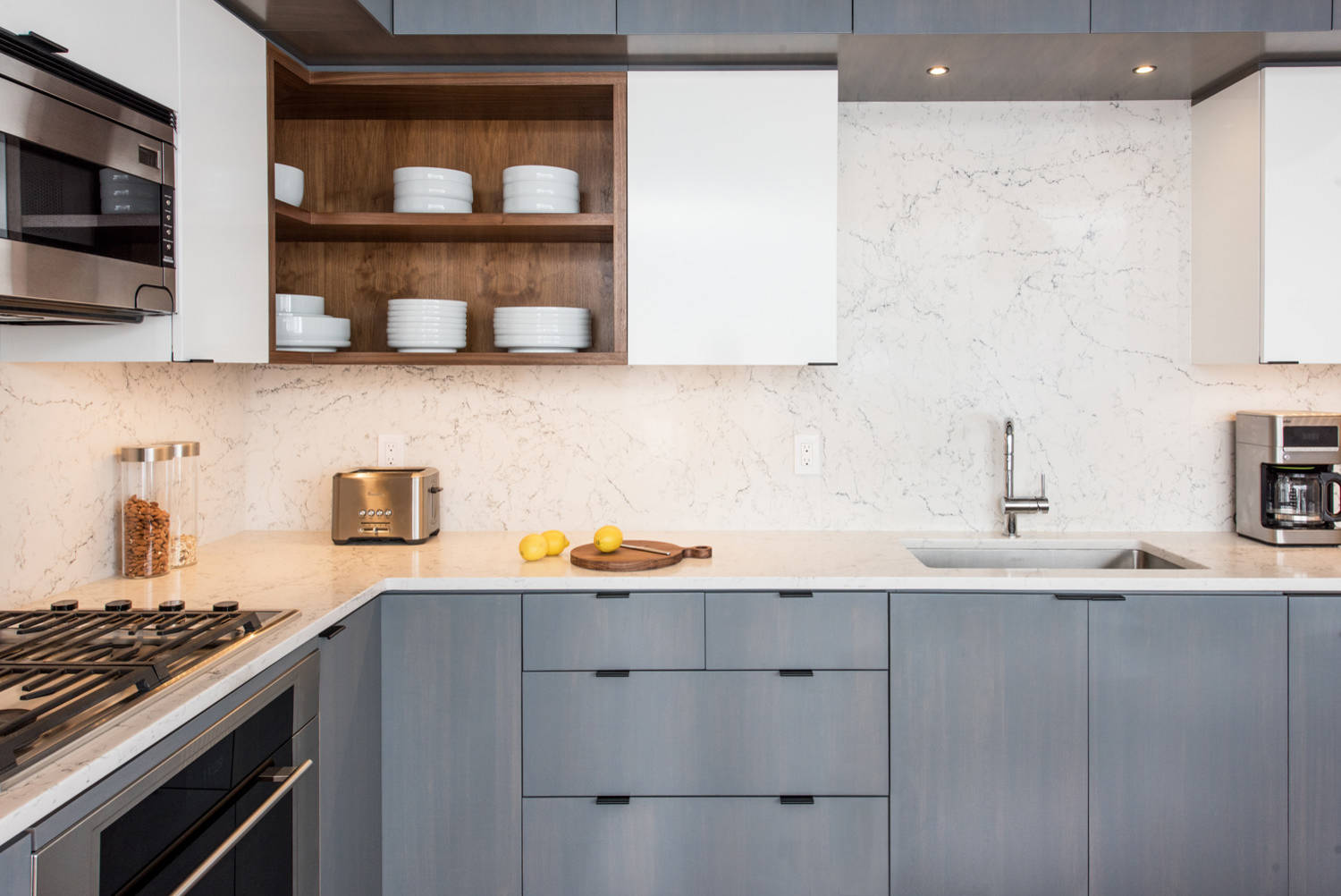 Получается угловая кухня из прямых модулей. Правда, в таком случае один из двух шкафчиков будет с так называемой «слепой зоной». Там удобно хранить крупную бытовую технику, которой пользуетесь редко. Для нижних секций такого угла ставят «паровозики» — тянешь за одну полку, из недр вытягивается вторая.