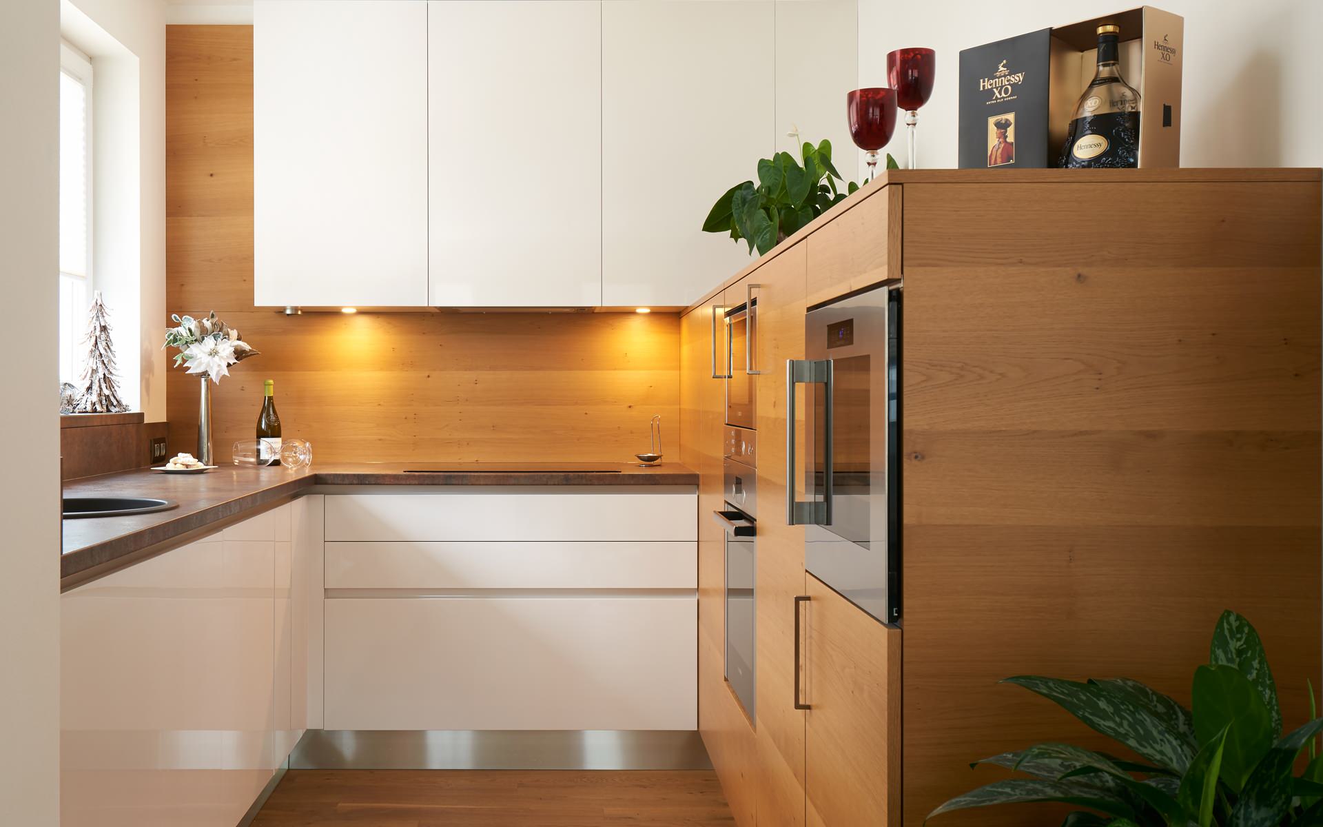Вернее, в линию будут располагаться только верхние шкафы кухни: низ угловой верх прямой, как в примере на фото. На освободившейся стене будет прекрасно себя чувствовать вытяжка в окружении так необходимого в небольшом пространстве «воздуха». А вы получите модный вариант: угловая кухня, верх прямой.