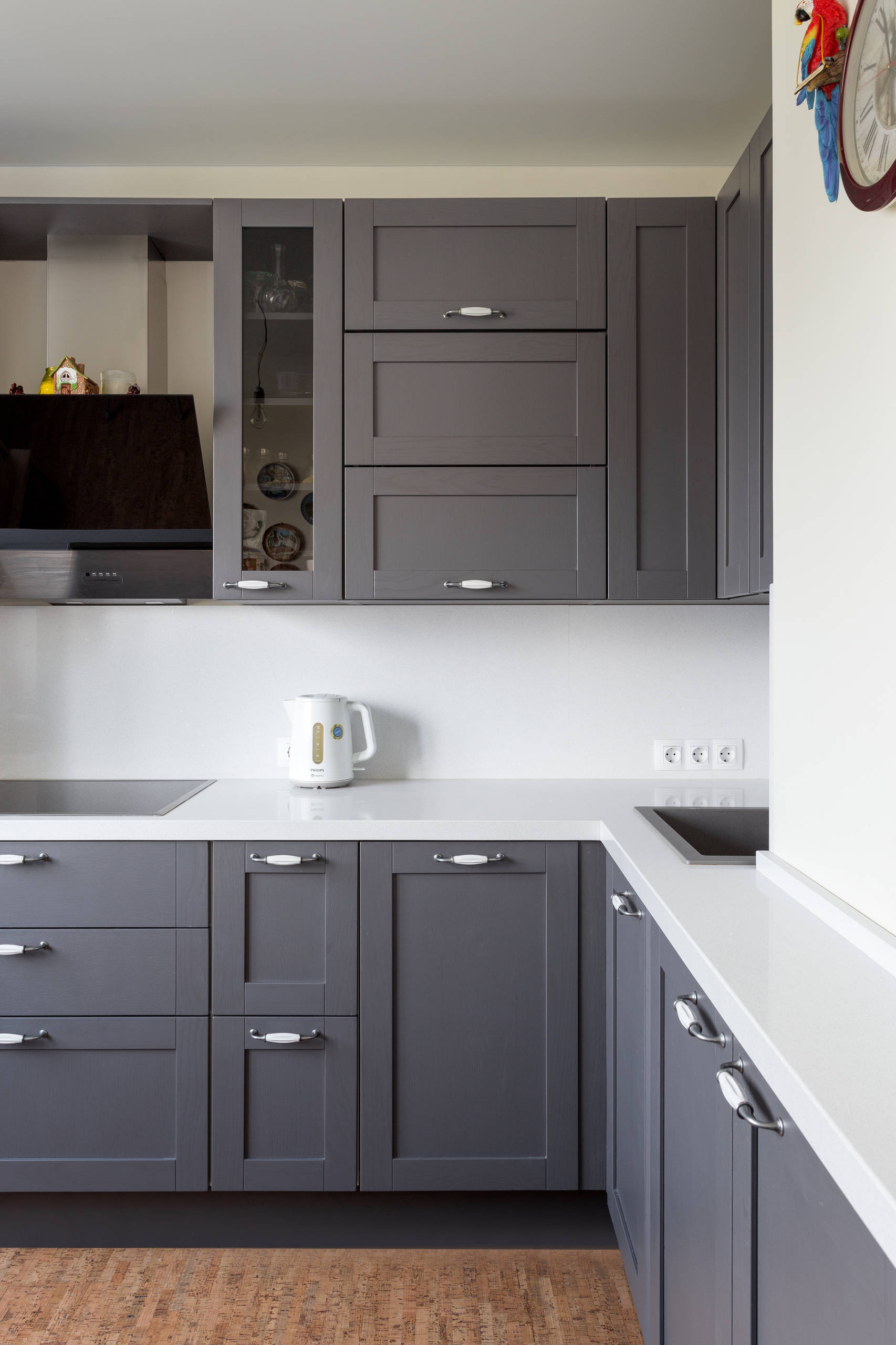 Отличный способ обыграть угловую кухню — расположить в углу конфорки и угловую вытяжку: пространство станет более открытым, и не будет обидно за потерянные сантиметры. Для такой расстановки производят специальные угловые модели вытяжек.