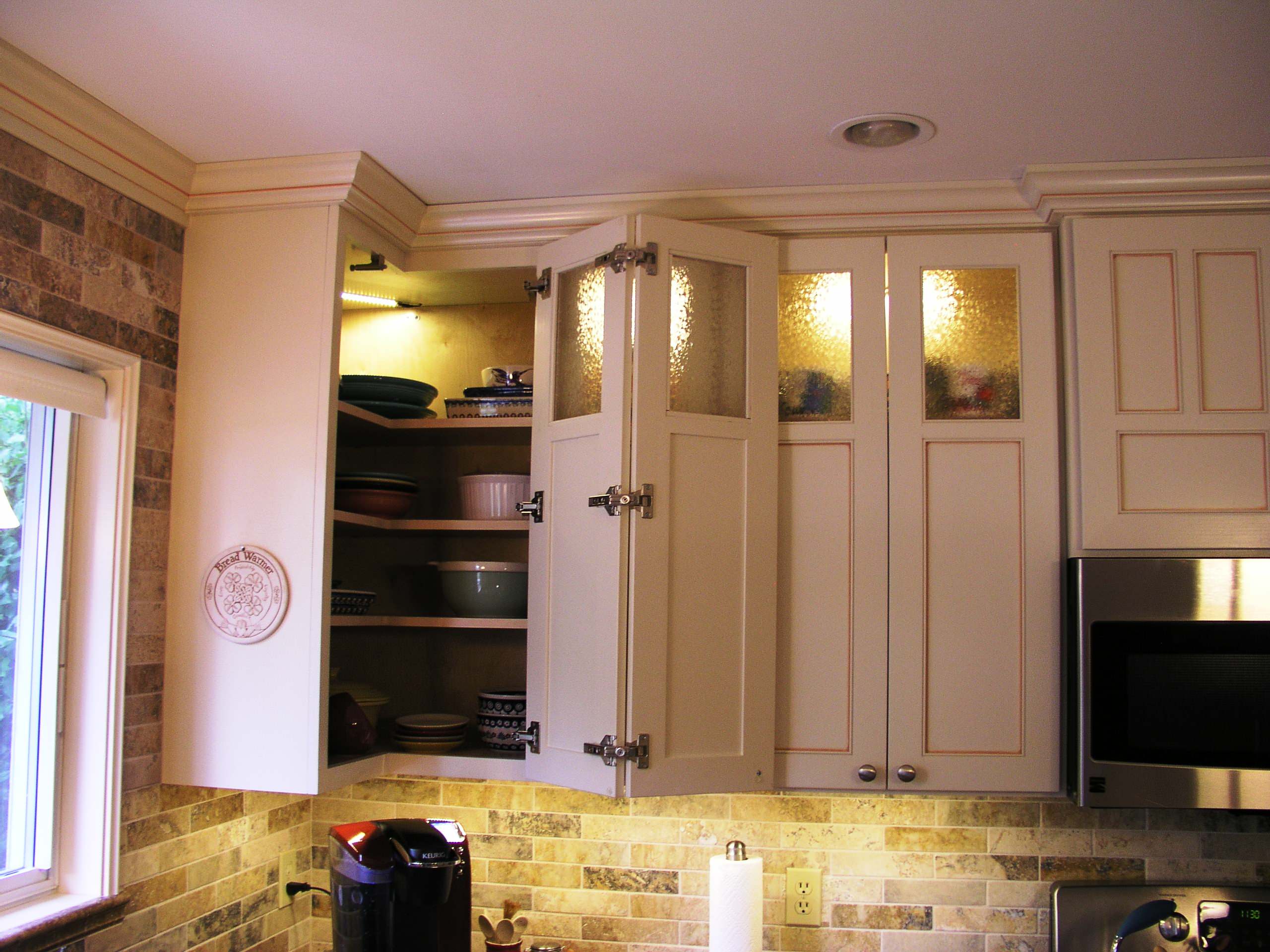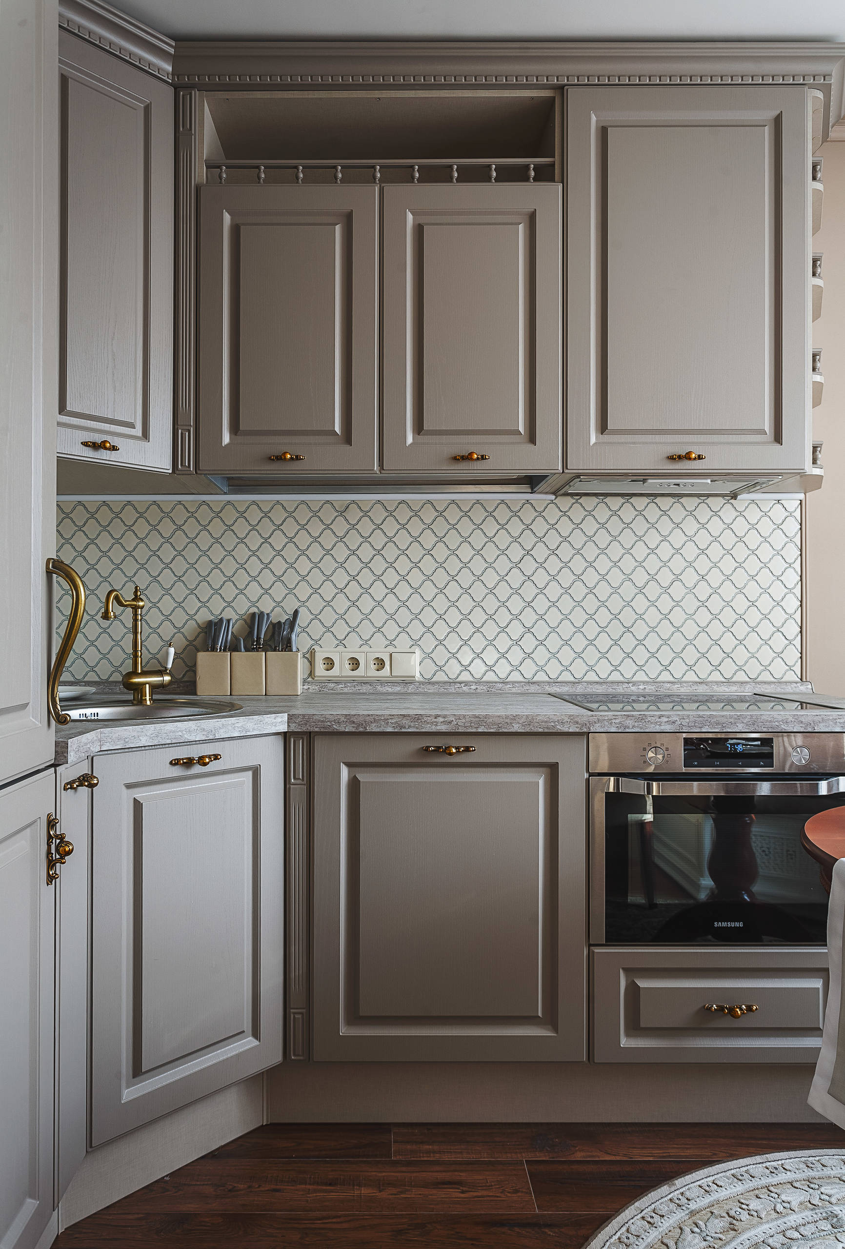 Если в нижней угловой секции у вас мойка, то вполне разумно сверху разместить сушилку для посуды. Угловая сушилка имеет форму буквы Г и более удобна, чем стандартная.