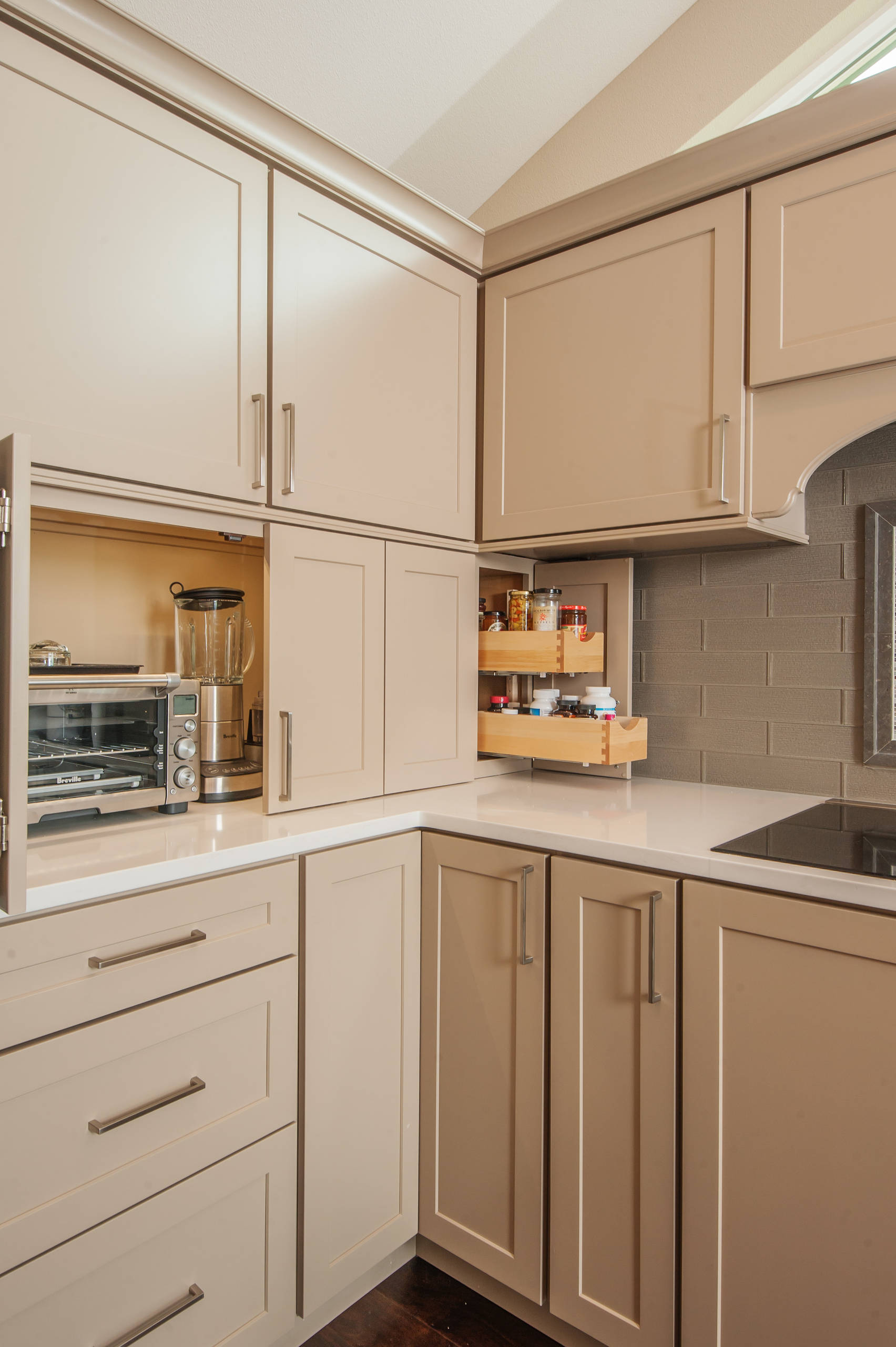 На фото: выдвижная полка для специй соседствует с гаражом для техники. За счет того, что дверцы сдвигаются в обе стороны, промежуток между верхним и нижним рядом шкафов используется рационально
