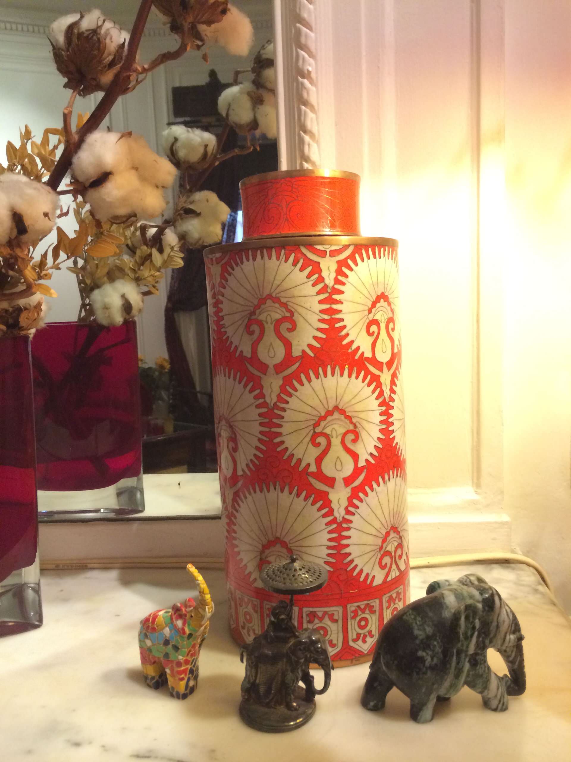 Les statuettes d’éléphants sont souvent des souvenirs rapportés de voyages lointains. C’est la babiole que l’on achète au marché, et qui nous remémore ensuite de doux moments de vacances. Alors, rien que pour ces clins d’œil qu’ils nous font, osons les exposer franchement, et assumer leur côté un peu kitsch (parfois). Autant jouer à fond la carte de l’éclectisme, et les marier dans toute leur diversité : marbre, métal, mosaïque… couleurs en vrac… Les oppositions donnent le ton.