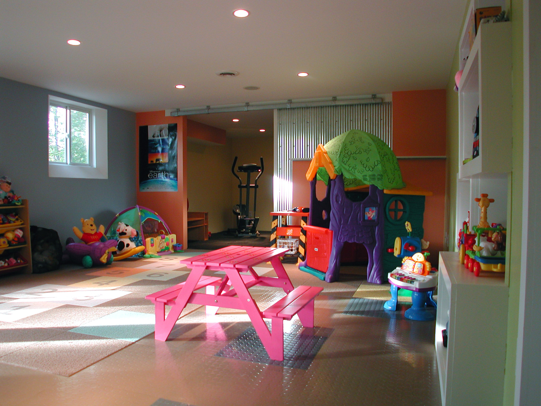N’oubliez pas les plus petits, toujours en besoin d’un bureau rigolo ou d’un support pour faire leurs coloriages. Dans cette salle de jeu, la table de pique-nique est peinte en rose et accueille joyeusement les activités des enfants.