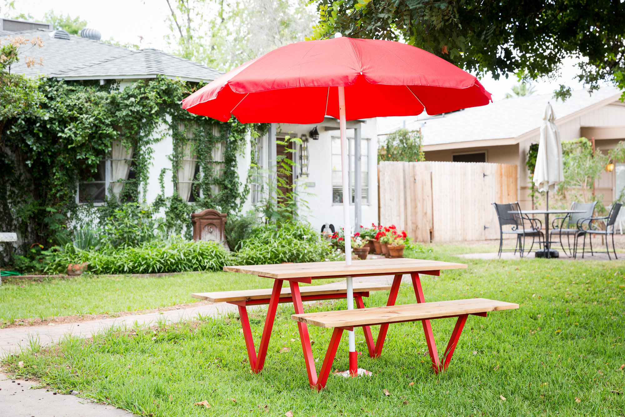Vous voulez égayer cette table que vous trouvez un peu trop terne ? Osez une teinte vive pour repeindre ses pieds. Le meuble apportera ainsi une joyeuse touche de couleur à votre jardin que vous pourrez facilement reprendre dans les accessoires, comme ici avec le parasol rouge.