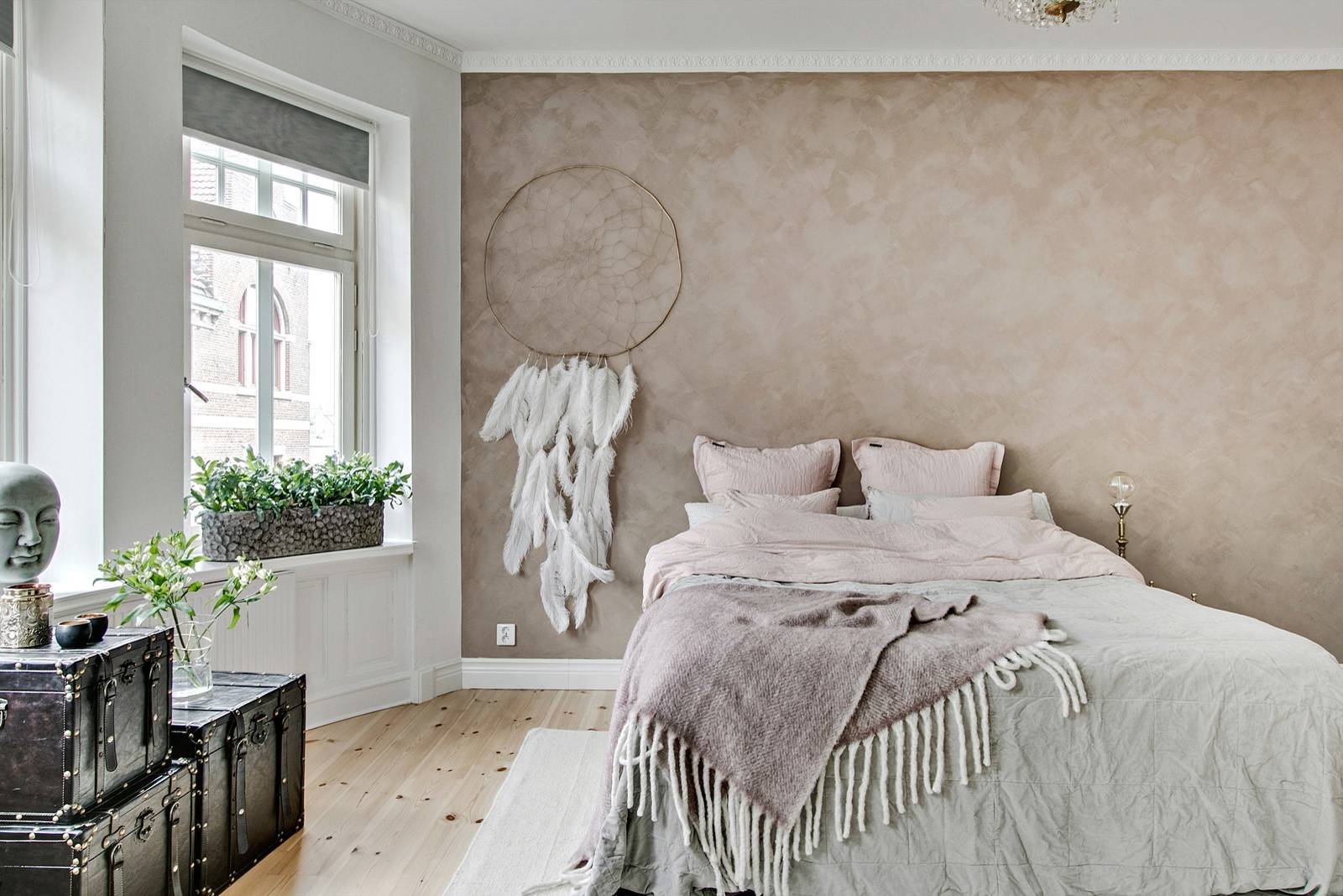 Des textiles naturels et doux à toucher. Cette chambre flatte tous les sens et réunit tous les critères de la Slow déco ! Ici, on fait appel au toucher avec des matières douces et naturelles, mais aussi au visuel en privilégiant des tons délicats, des couleurs claires, sourdes et reposantes. On imagine très bien que l’odorat puisse être de la partie avec des bougies parfumées, une subtile odeur de savon de Marseille, un parfum naturel de fleurs ou d’herbe fraîche. Enfin, l’ouïe ne sera pas oubliée avec l’utilisation de matières qui absorbent le bruit et une descente de lit en fibres naturelles.