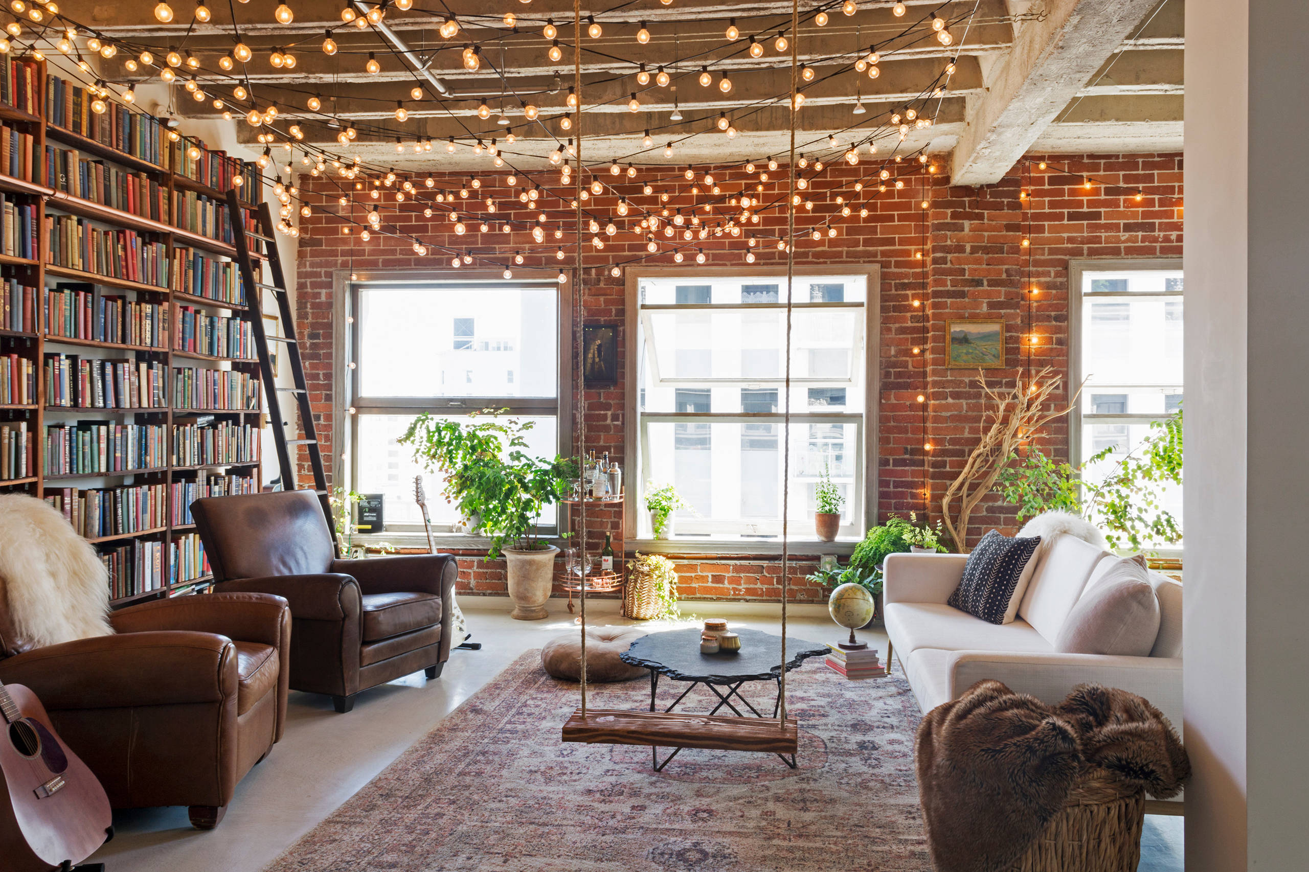 De la poésie, de l’inventivité. Même dans un loft de Los Angeles, la tendance Slow déco s’installe pour le réhumaniser ! Faisons le tour : des fauteuils club chinés qui ont fait leurs preuves, une balançoire que l’on peut faire soi-même avec une planche de bois et deux cordes, une table basse à partir d’une plaque d’ardoise, des plantes vertes, des moumoutes toutes douces… Sans oublier une guirlande lumineuse en guise de ciel étoilé !