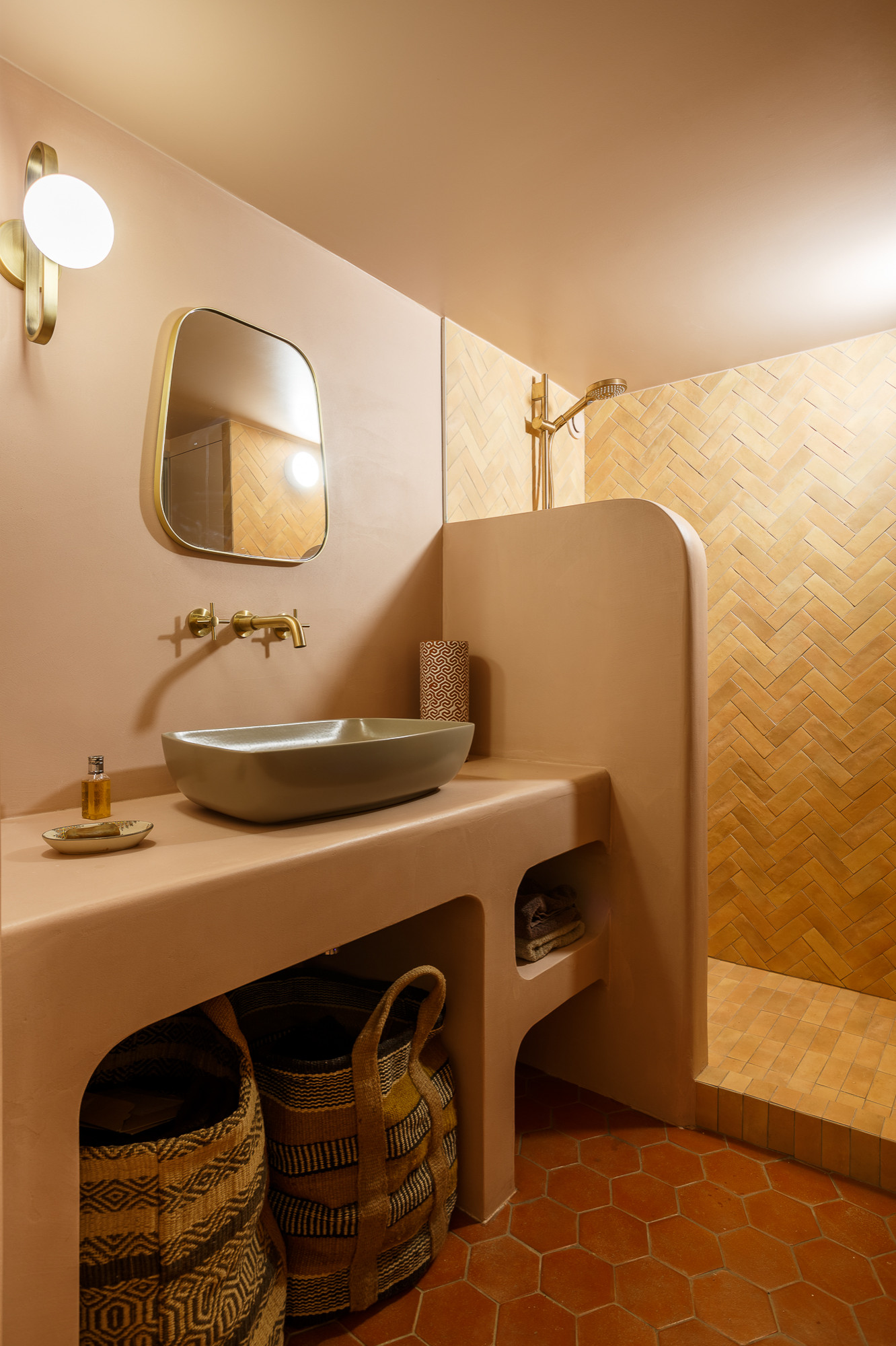 Ici, l’utilisation du béton ciré est intéressante pour le mélange de styles qu’elle apporte. Les formes du mobilier semblent faire un clin d’œil aux années 70, tandis que la couleur du revêtement, la présence de niches et de paniers tressés évoquent les salles de bains des riads entièrement vêtues de tadelakt. Les touches de doré terminent cette ambiance unique.