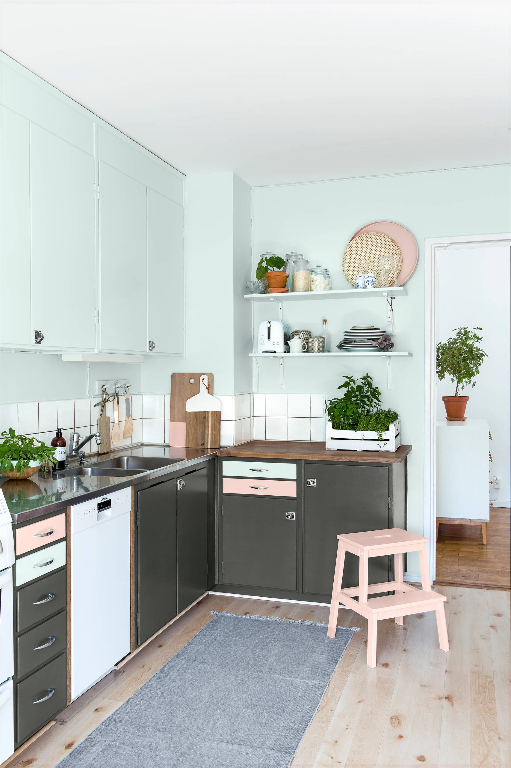 Si vous aimez le vert pastel, déclinez le rose poudré par touches dans une cuisine (mobilier, crédence, luminaire) ou une chambre (mobilier, luminaire, textile) pour une déco rétro !