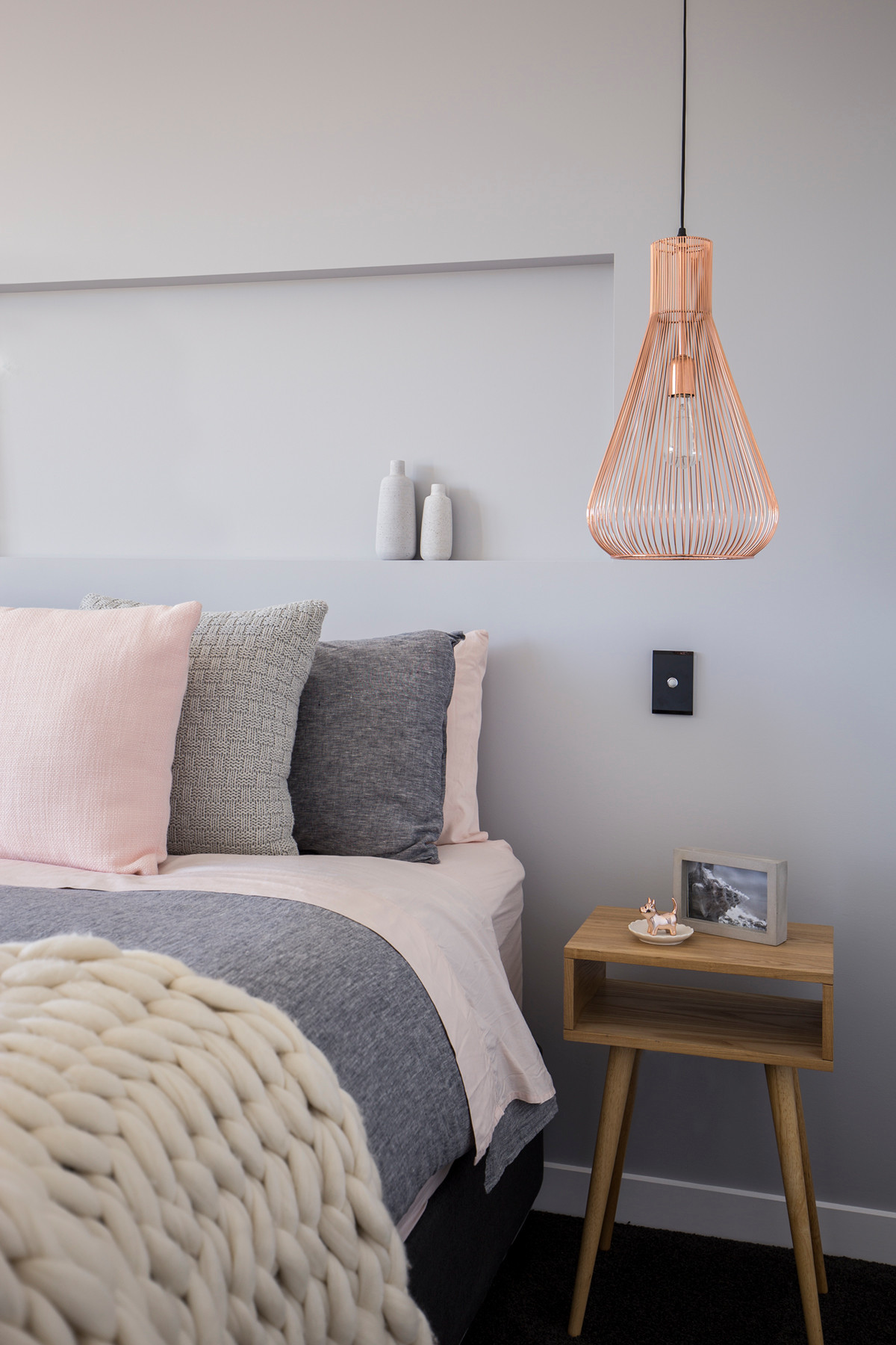 Mariage réussi dans cet exemple entre ces deux suspensions cuivrées oversize et le rosé poudré du mobilier, des textiles et du mur.