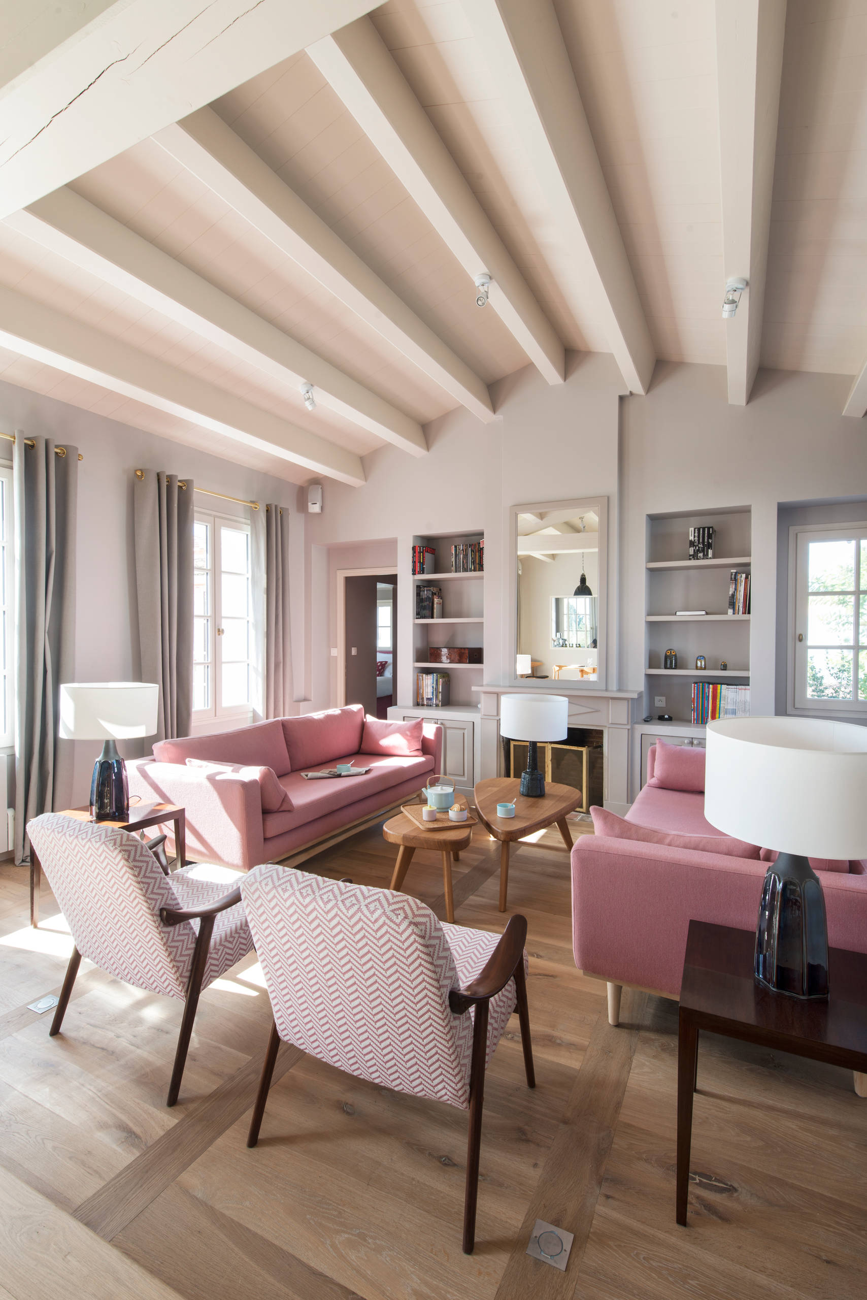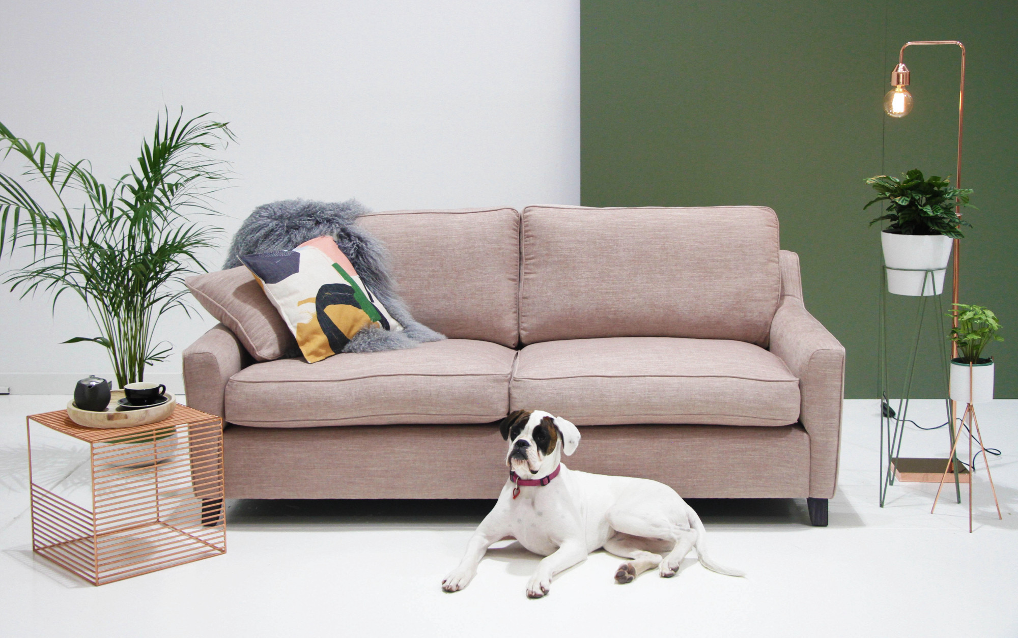Il rajeunira aussi un canapé gris, vu et revu depuis des années. Ce modèle rose poudré apaise l’ambiance sans pour autant l’endormir !