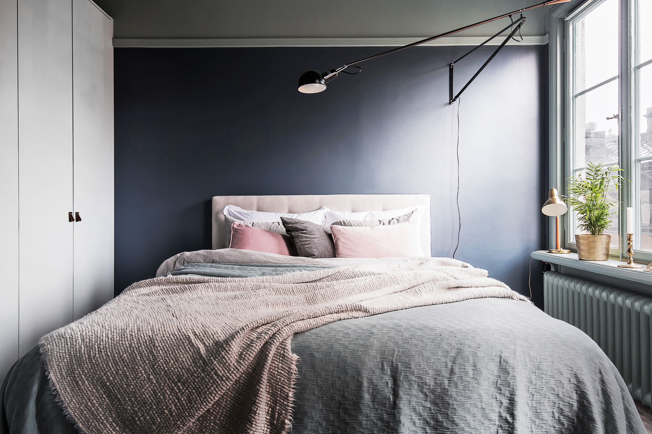 Ou encore, avec du bleu ou du violine, dense et profond, en couleur dominante comme dans cette chambre où le rose poudré se décline subtilement dans le textile.