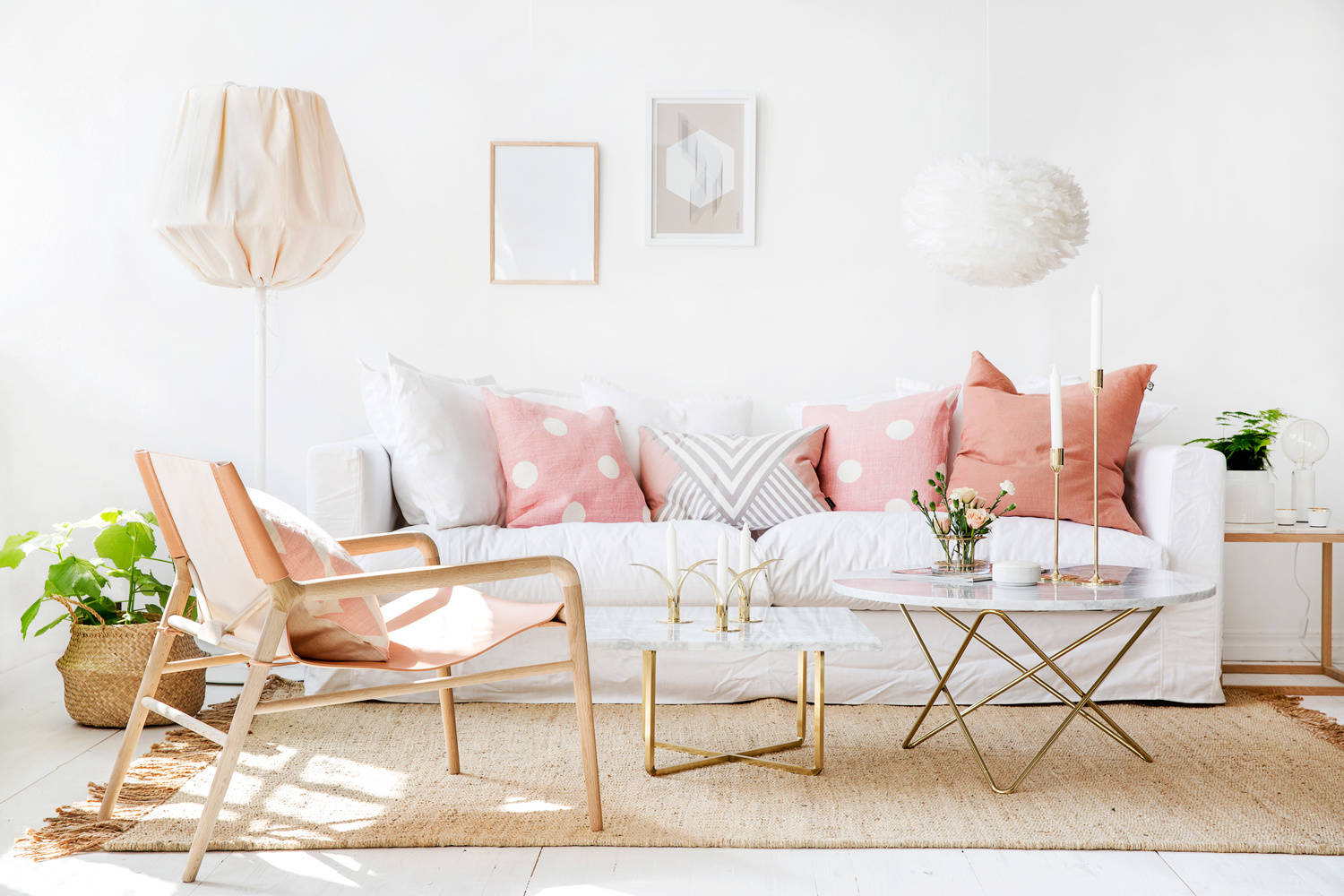 Dans ce salon suédois, on aime aussi les plateaux des deux tables basses en marbre. Chic et tendance, cette matière s’adoucit au contact du rose poudré !
