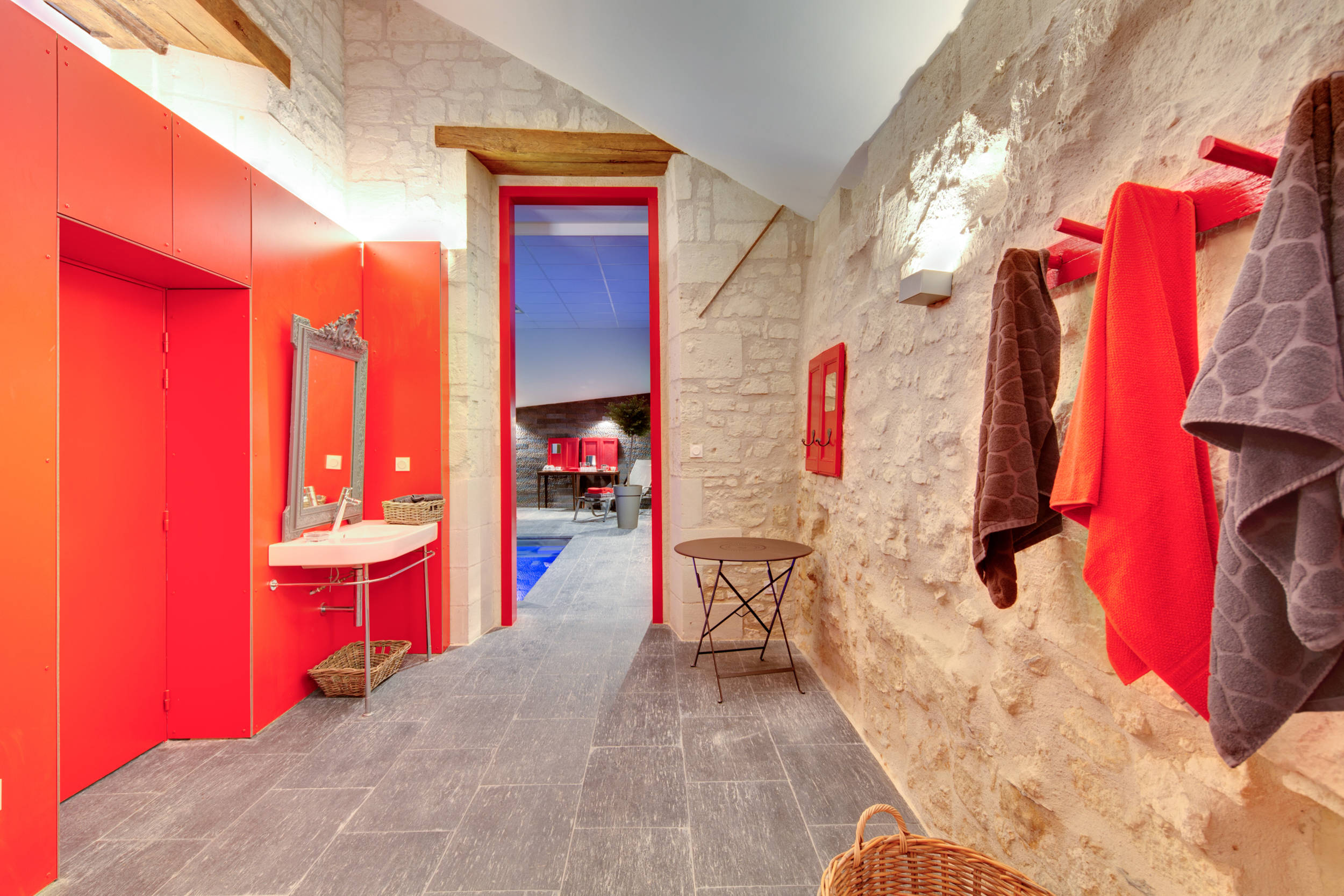 Le rouge aime les belles matières naturelles. De même qu’il se marie parfaitement avec les bois, qu’ils soient clairs ou foncés, il joue parfaitement avec la pierre. Avec un mur en pierre dans des tonalités écru ou sable, il accentue la chaleur, et apporte une touche tonique. Si la pierre est davantage dans des nuances de gris foncé, le rouge apporte une note lumineuse et contemporaine. L’un et l’autre se complètent et se subliment, c’est un mariage parfait, pour une ambiance propice à la sérénité.