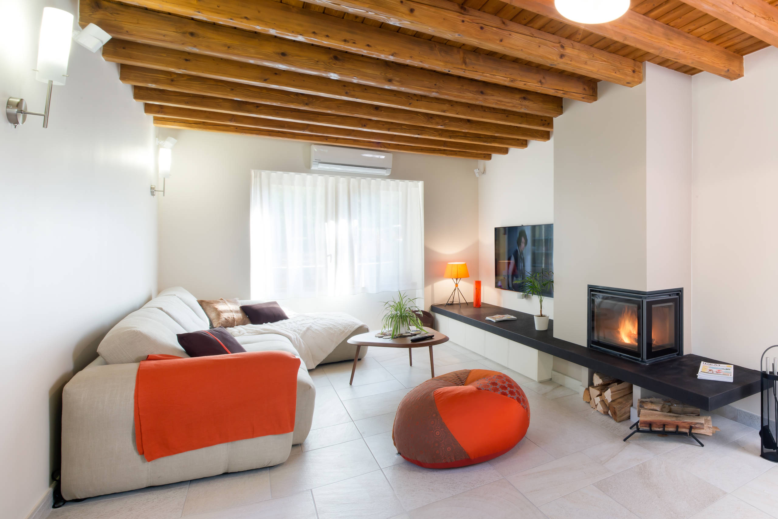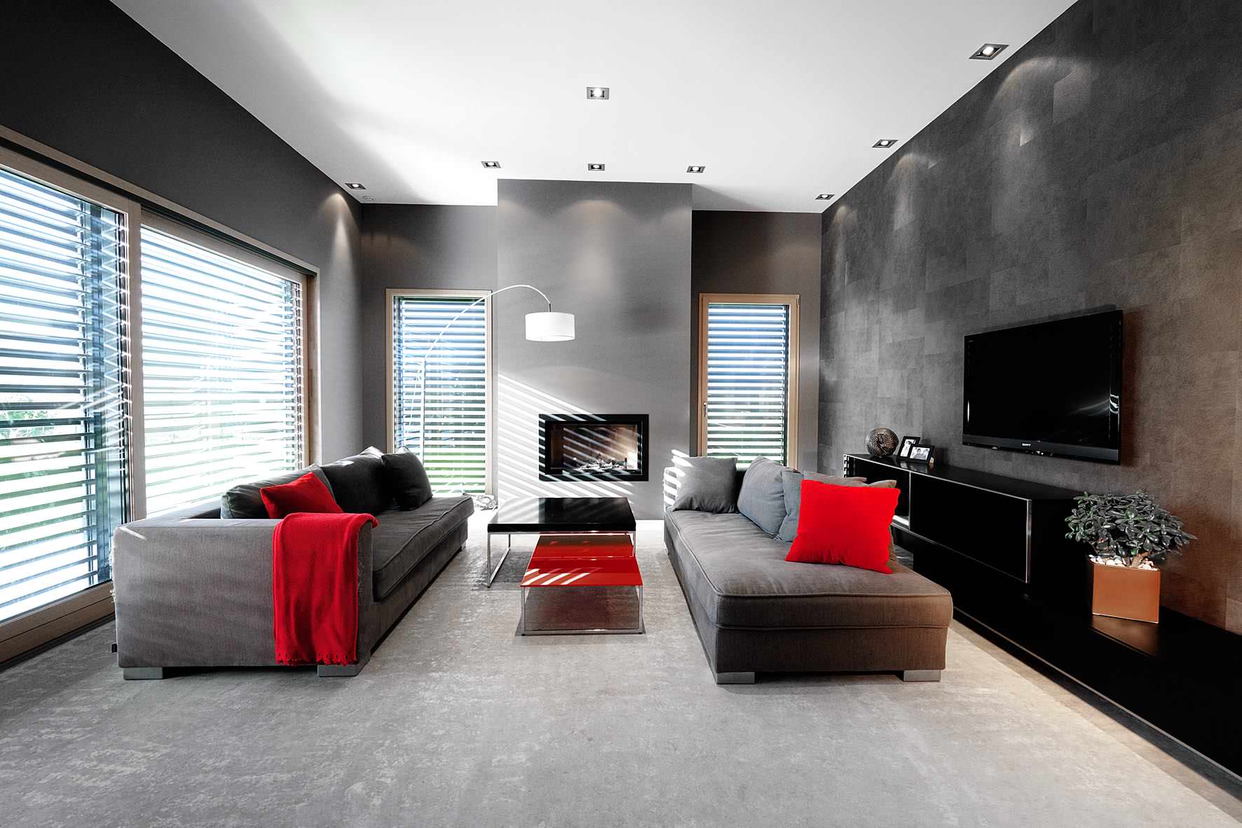 Le rouge est un merveilleux apporteur d’équilibre dans la gamme colorée qui va insuffler l’atmosphère d’une pièce. Dans une pièce où le gris domine, le rouge apporte un peu de chaleur, de douceur, tout en dynamisant une ambiance qui, sans sa présence, serait plutôt fade. C’est la touche de peps, mais un peps subtil, qui préserve l’ambiance zen conférée par l’harmonie des gris choisie pour ce salon. Cette ambiance est très raffinée, et apaisante. Toutefois, elle nécessite idéalement un bel apport de lumière naturelle, pour que le rouge puisse révéler tout son potentiel et relever la base des gris.