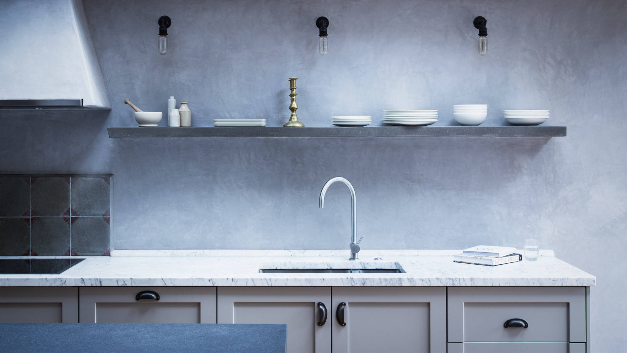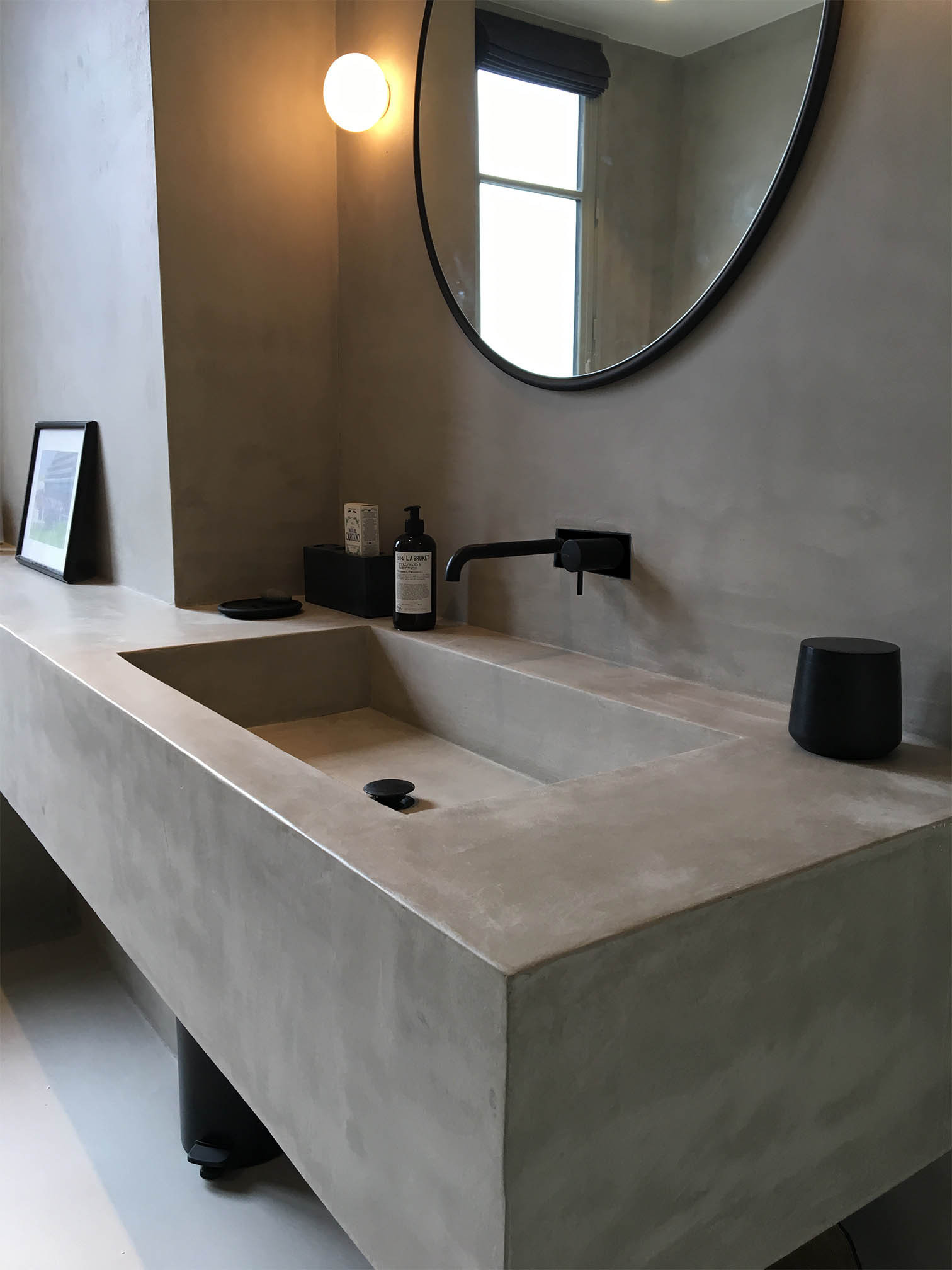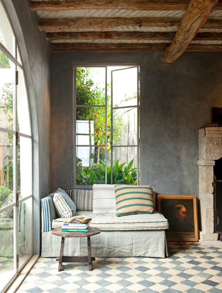 Le béton peut être véritable comme ce sol sur cette photographie, recelant encore des graviers. Il a été poli à la meuleuse. Mais vous pouvez obtenir également un sol dit « béton » avec un enduit décoratif. C’est le cas de celui qu’on appelle « béton ciré », composé de ciment, de résine, de minéraux et parfois de pigments colorants. Il s’applique alors sur un sol intérieur ou extérieur constitué d’une chape ou dalle de béton, ragréage, possiblement bois agglo de type OSB ou stratifié ou directement sur un carrelage en recouvrant les joints. Sa formule « prêt à l’emploi » le démocratise, parfois en kit béton ciré composé de l’enduit minéral et du vernis de protection. On découvre aussi sur cette image un joli plâtre vénitien mural. Il s’agit, nous y reviendrons plus loin, d’un enduit à base de chaux (c’est-à-dire de décomposition thermique de calcaire et de sable), dont le procédé remonte à la Renaissance italienne. Comme le tadelakt marocain, la chaux n’a pas dit son dernier mot.