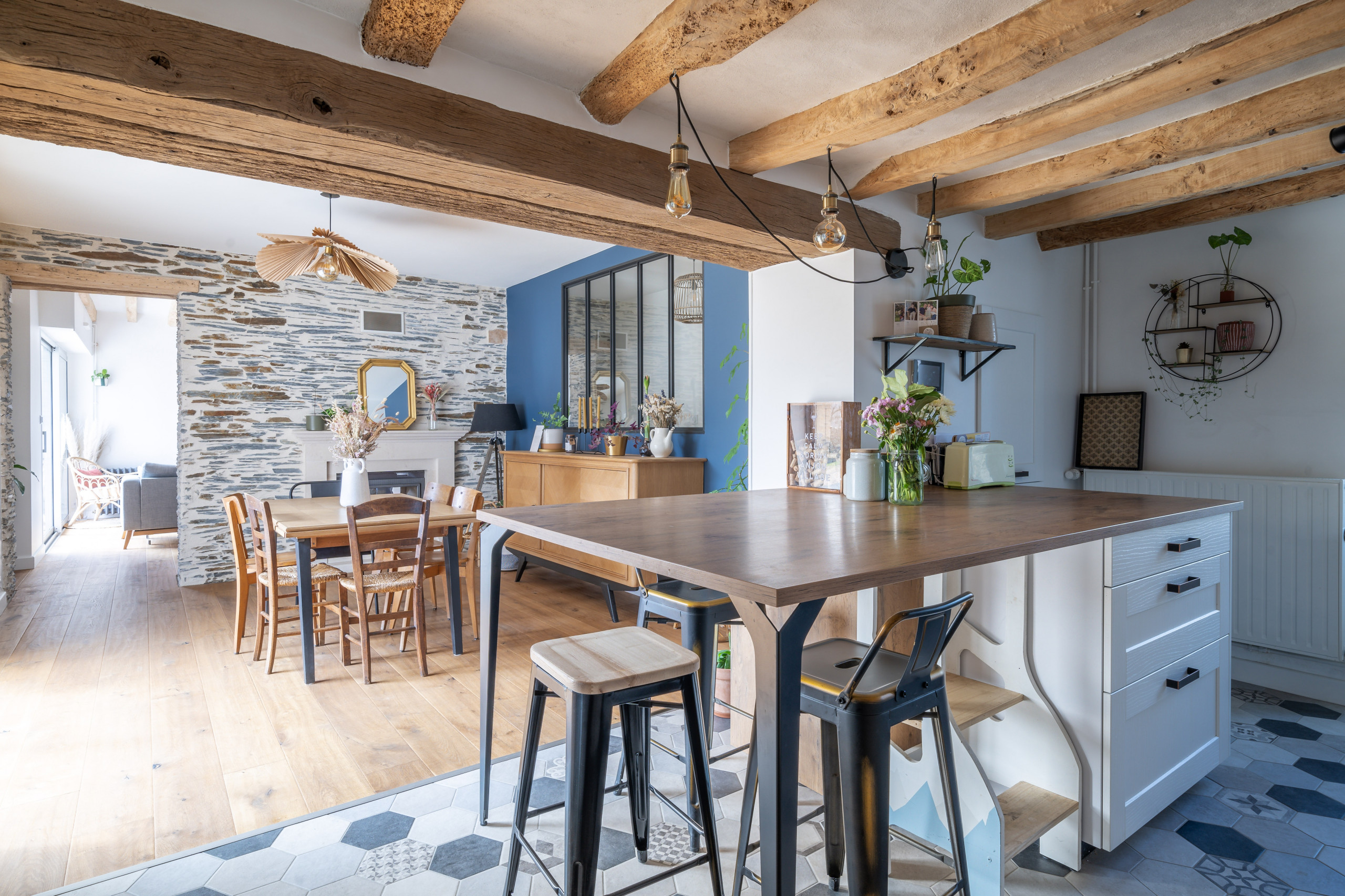 Dans cette cuisine, un sol en béton ciré et un enduit mural à la chaux, pour recouvrir ou juste jointer les pierres, s’accordent à merveille. Au sol, il est conseillé d’appliquer un enduit béton, plus résistant et recouvrant, masquant et lissant, surtout s’il s’agit de le passer par-dessus un carrelage et ses joints. Son vernissage sera étanche. Il existe en incolore ou en différentes teintes (quartz, sable, silex, zinc, cobalt, cacao, argile rouge…) et en finition mate, brillante ou satinée.