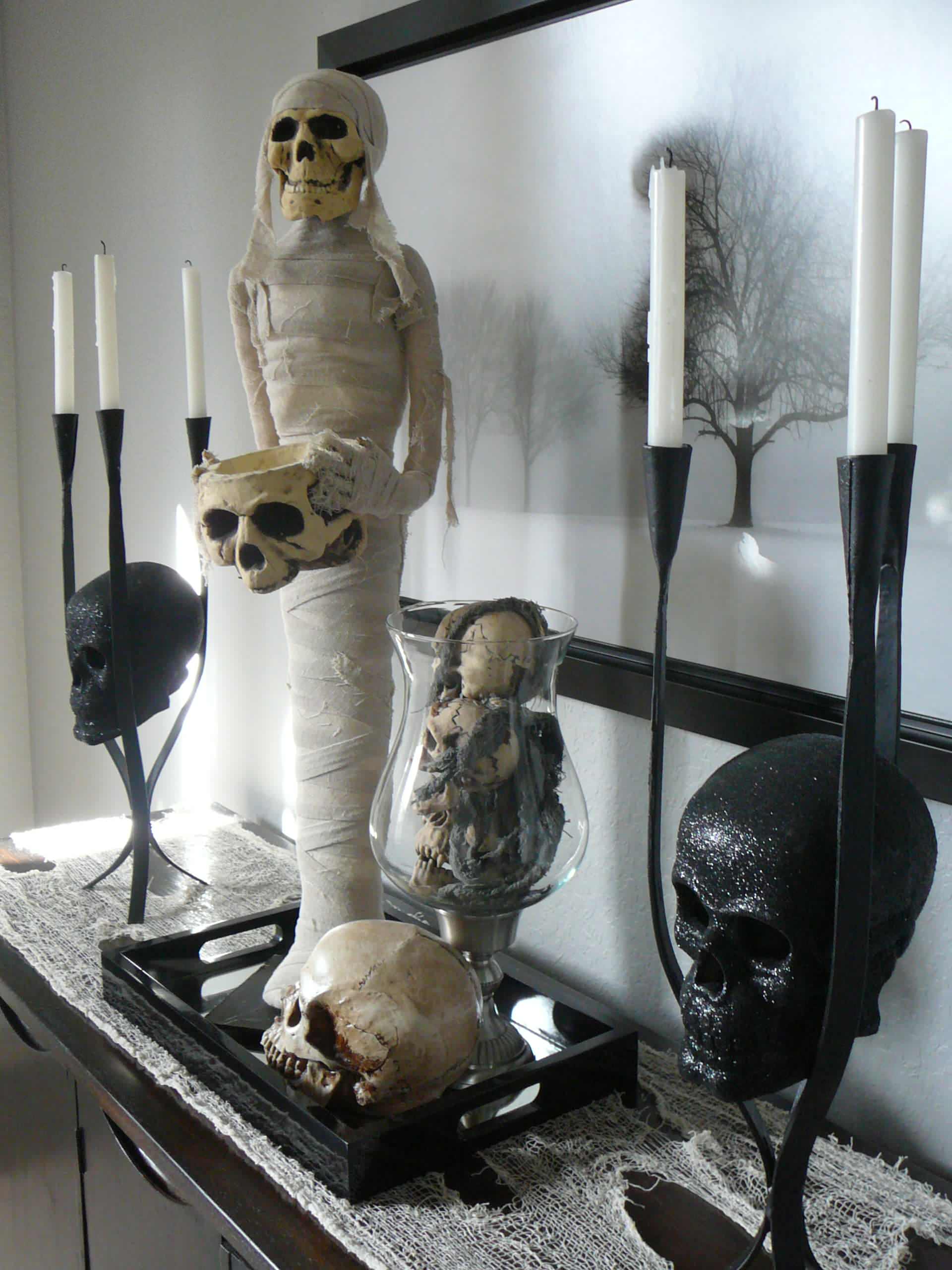 Pour un ensemble cohérent et entièrement dédié à l’événement, pensez à métamorphoser tous vos meubles en les rehaussant avec des objets déco plus ou moins effrayants. Et caractéristiques des visions d’horreur recherchées pour l’occasion.
