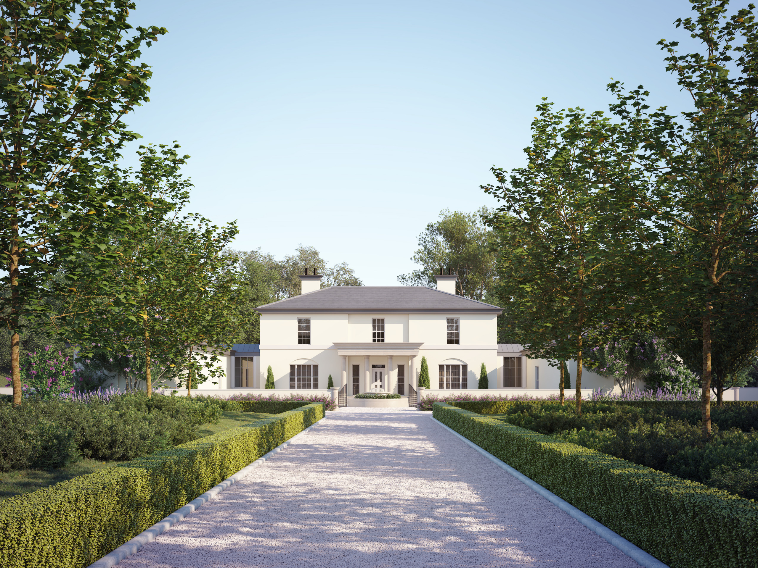 Cette allée et ce jardin de mckenna + associates sont un exemple en matière de sobriété végétale et d’élégance. Des haies bien taillées aux arbres uniformément espacés, tout a été soigneusement étudié dans ce jardin. Le calme inspiré par la palette de teintes vertes se marie bien avec le gravier gris pâle et les pierres de bordure, pour un ensemble visuellement reposant.