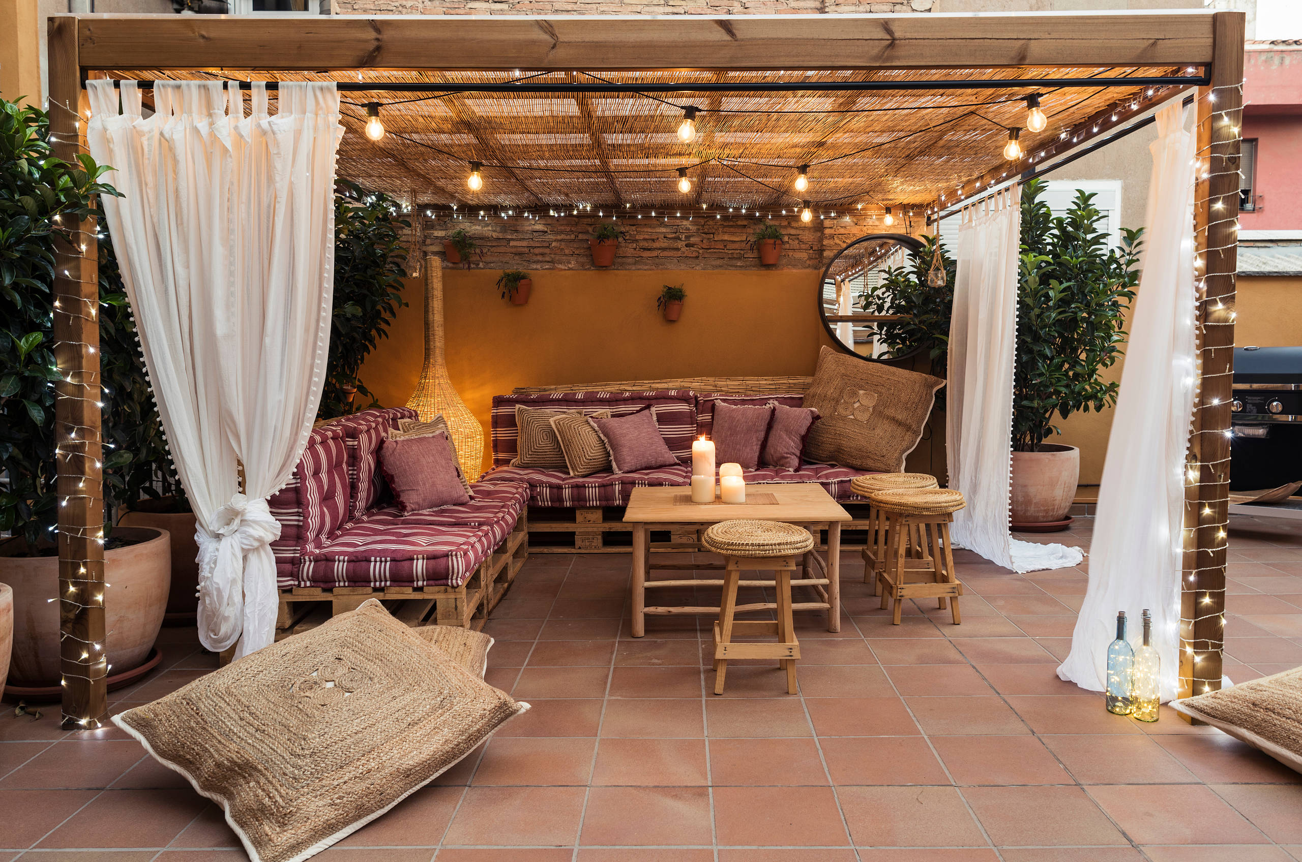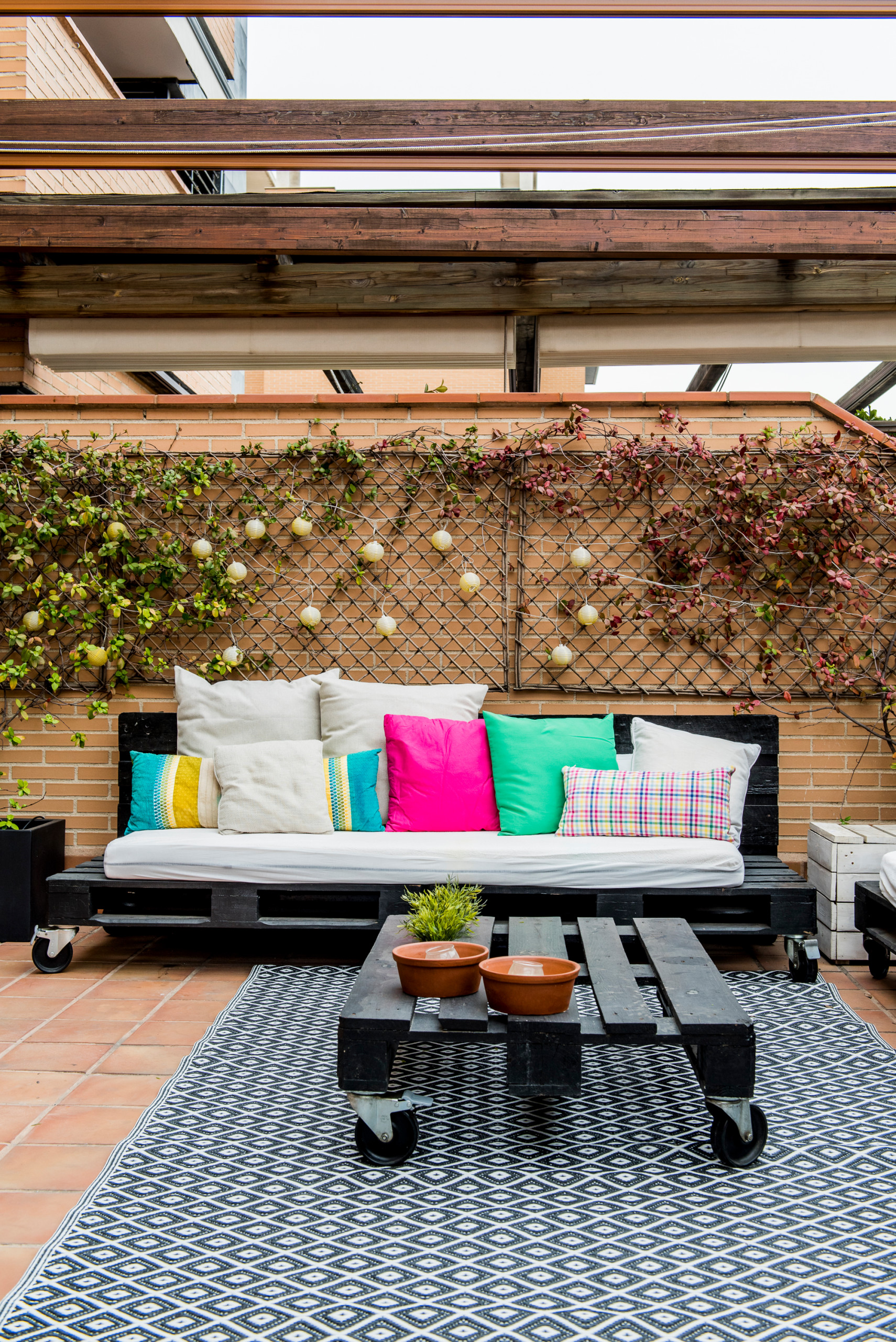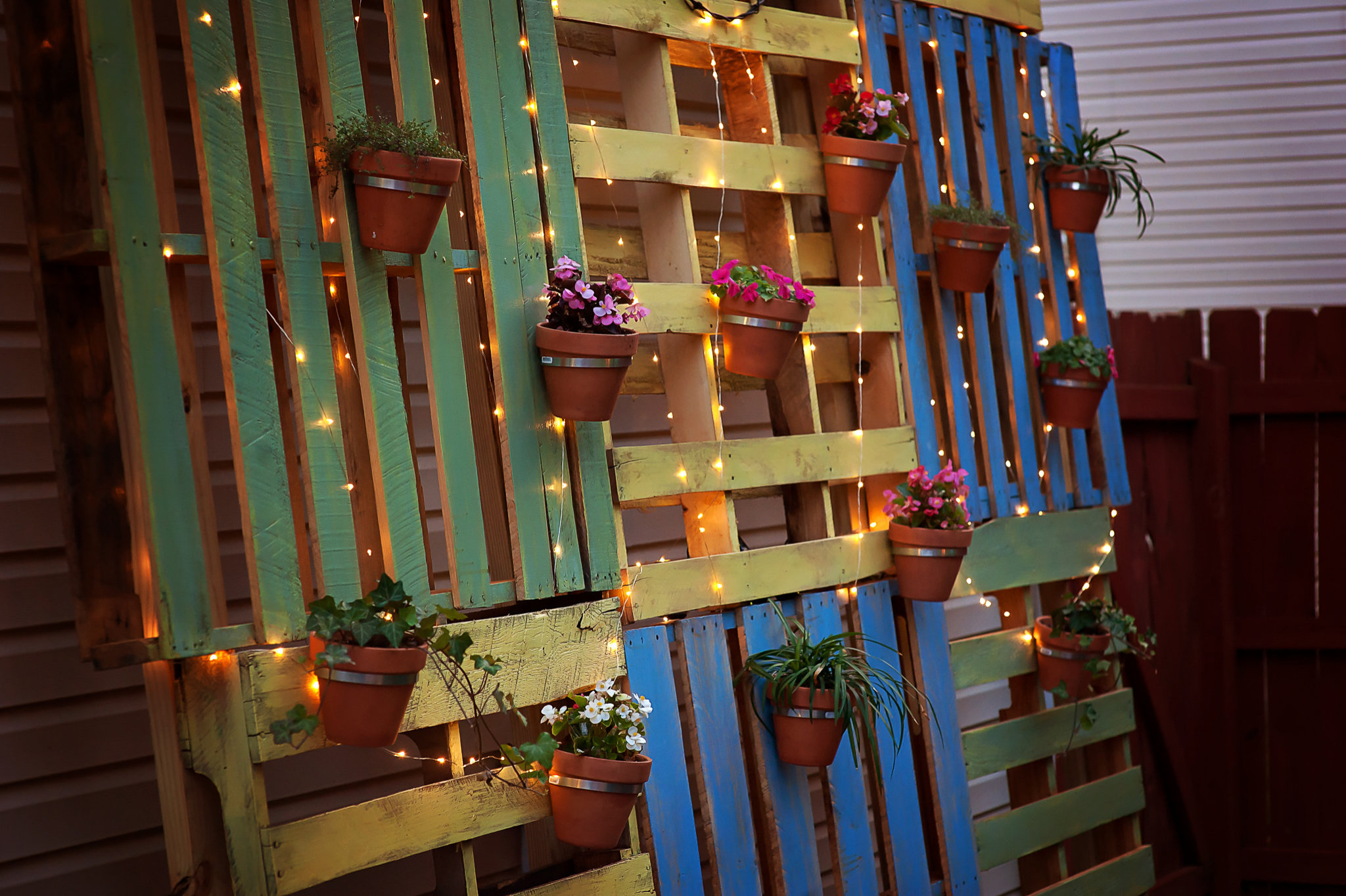 Une autre solution consiste tout simplement à accrocher des pots de fleurs et plantes sur une paroi composée de palettes, peintes ou à l’état brut. Agrémenté de guirlandes lumineuses, l’ensemble ne manquera pas de faire son effet.