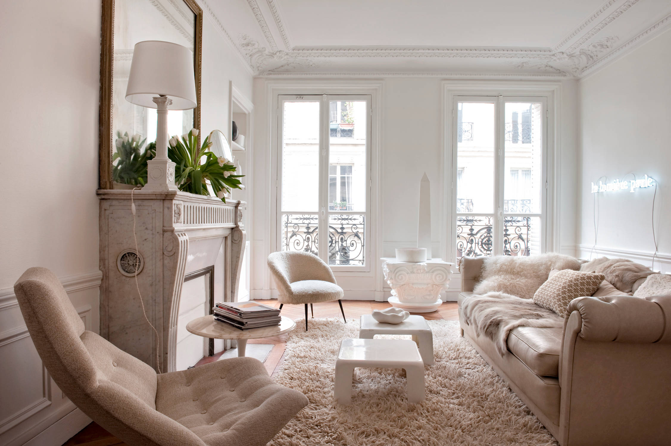 Pour magnifier les moulures de votre appartement, la solution la plus simple est d’adopter une décoration tout en blanc, du sol au plafond. Des meubles blancs, un tapis ivoire, et en clin d’œil un chapiteau grec, et le tour est joué. À réserver aux pièces ayant des moulures richement ornées, pour un effet maximal.
