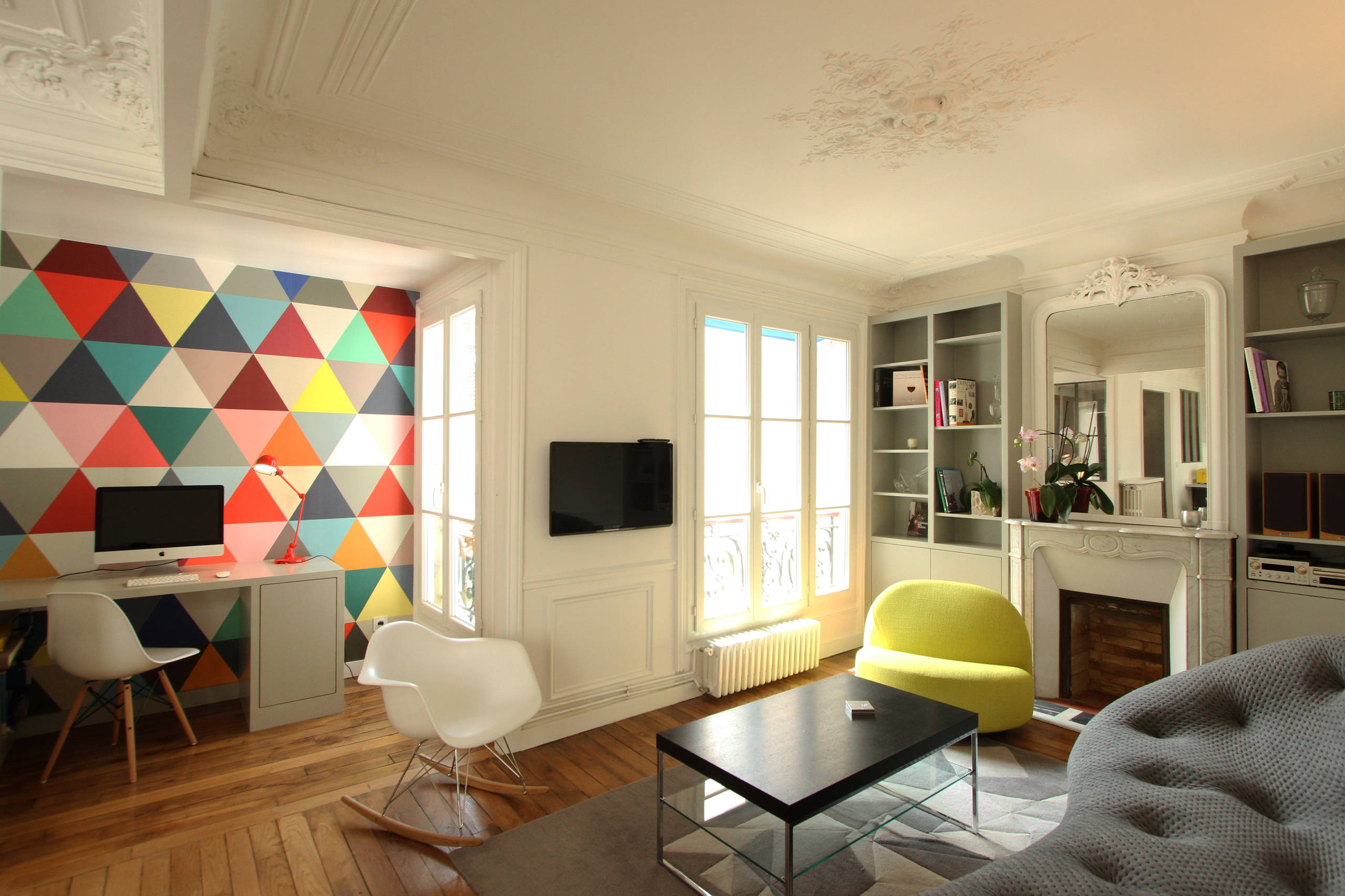 Pour les plus audacieux, osez les grands motifs géométriques, comme ce modèle Mosaic de Minakani Lab. Effet tonique garanti. Et de manière tout à fait paradoxale, les rosaces et moulures du plafond sont dans leur élément.