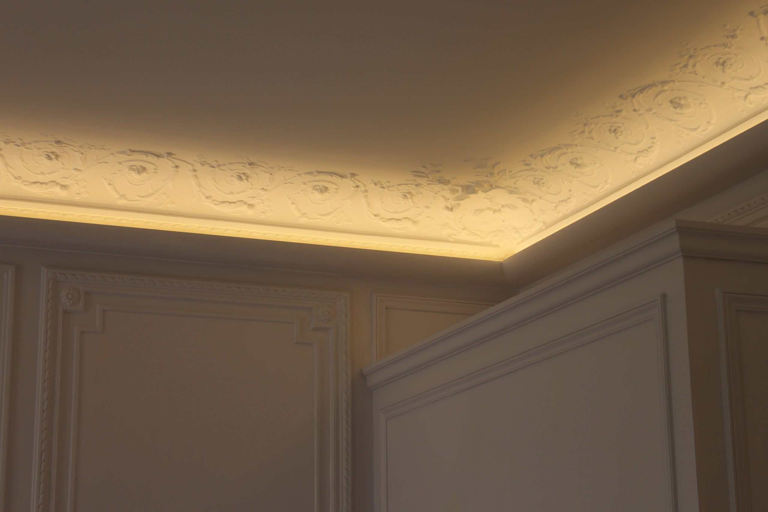 Astuce : vous pouvez aussi rajouter une corniche en creux, pour y intégrer un ruban à LED, sur variateur. Ce halo nimbe la pièce de mystère et magnifie les moulures de ce bel appartement haussmannien.