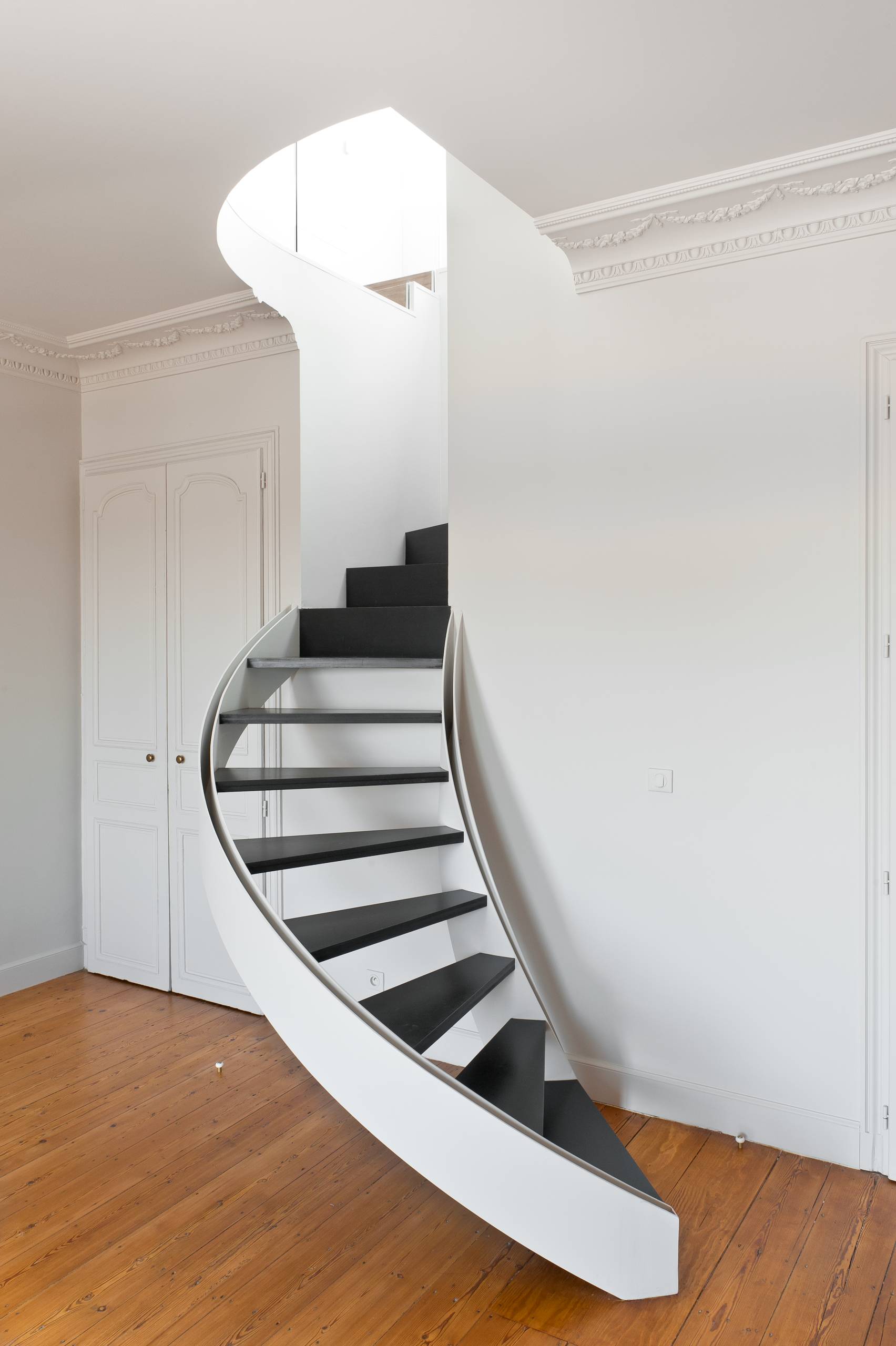 A priori, l’exercice est osé : casser le linéaire de moulures (ô sacrilège) pour y faire passer un escalier design. Le résultat est amusant et élégant. En montant cet escalier, vous pourrez admirer au plus près guirlandes de feuilles et fleurs courant le long de la moulure. Un travail tout en finesse dans l’esprit XVIIIe.