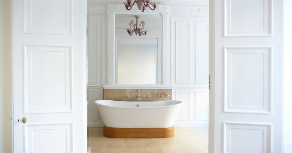 La simplicité est de mise pour mettre en valeur les moulures : épurez au maximum mobilier et accessoires, en retenant l’exemple de cette somptueuse salle de bains : seule la baignoire trône au milieu de la pièce, et symétrie et ordonnancement de ces moulures, a priori toutes simples, nous en mettent plein la vue !