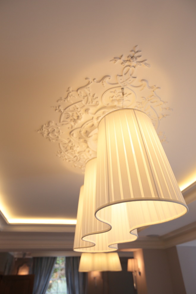 Les moulures, du fait de leur relief en pleins et en creux, contribuent à la modulation de la lumière. Mettre l’accent, par un lustre contemporain ou une corniche, sur le motif des moulures et rosaces, c’est apporter tout de suite un peu de magie à une pièce.