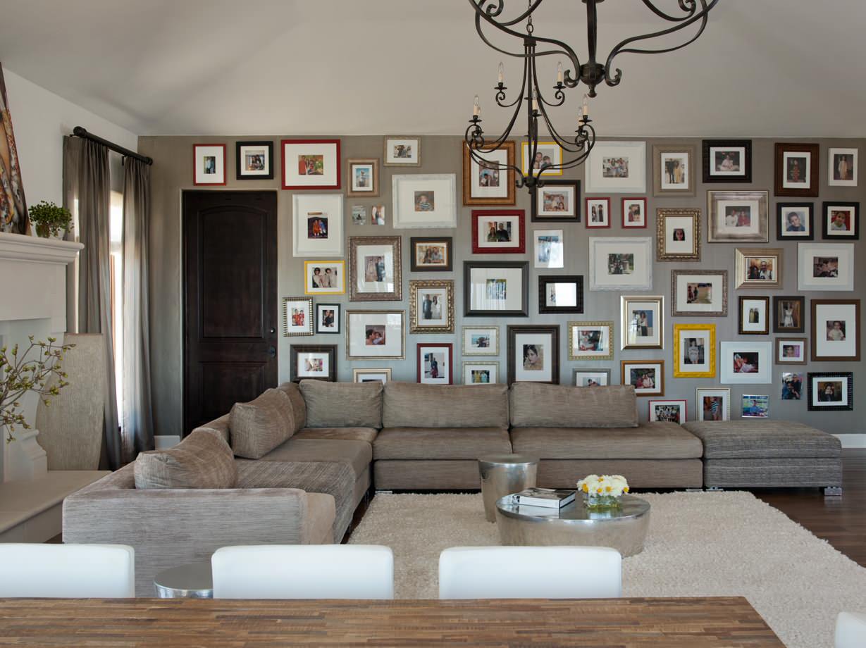 Dans le salon, les cadres photos habilleront les murs efficacement. Attention à ne pas en faire trop. Si l’intégralité du mur est recouvert, l’ambiance sera alourdie.