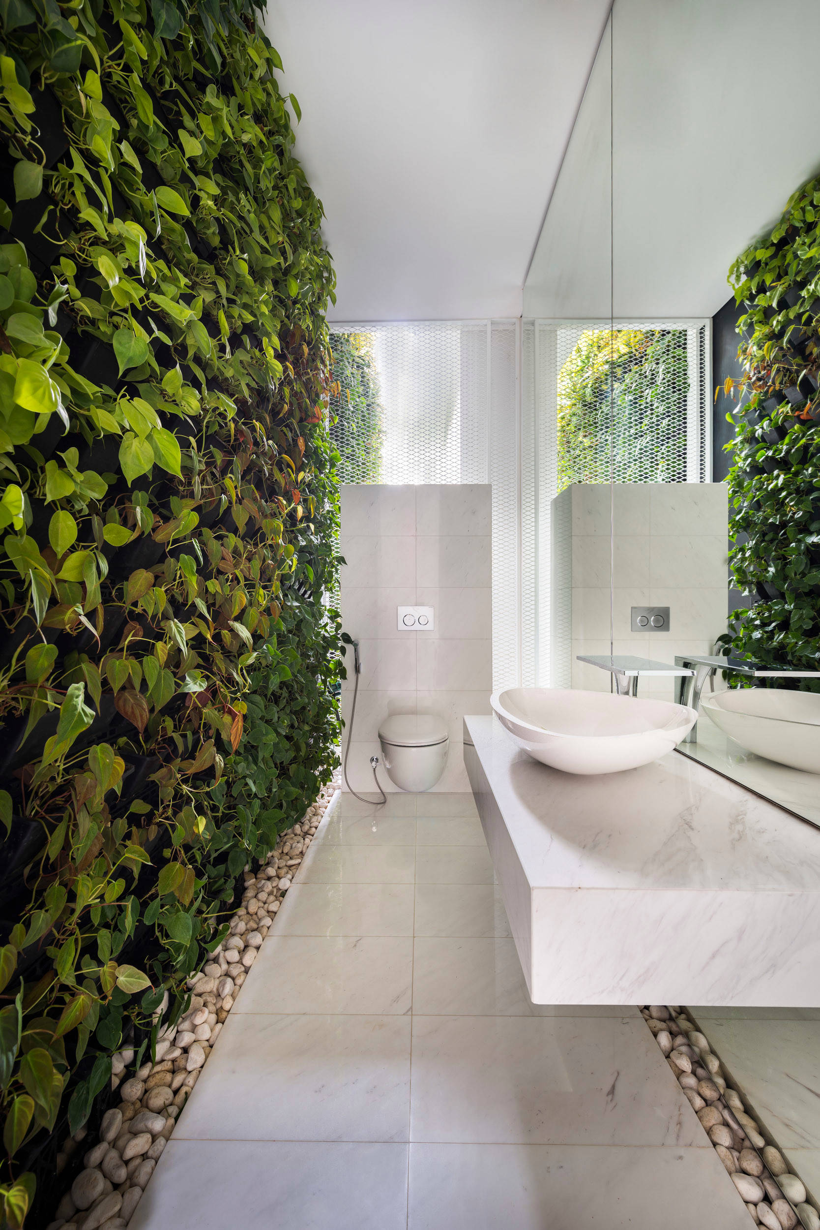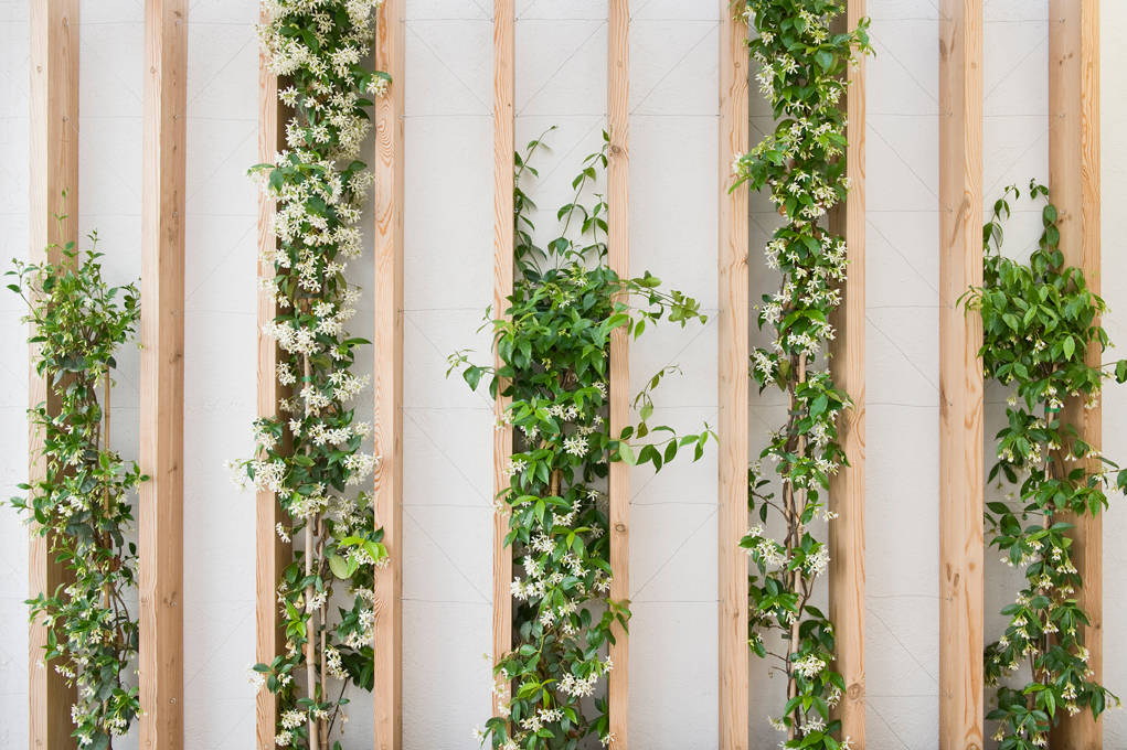 C’est en Espagne que nous avons repéré cet aménagement des plus originaux. En plus de parfumer délicatement les lieux, ce jasmin donne un côté à la fois contemporain et naturel à la décoration. Ici aussi, sa croissance se fait sur une structure métallique très discrète, mais elle est contrôlée par la présence de tasseaux de bois de chaque côté, qui créent des lignes végétales sur le mur.