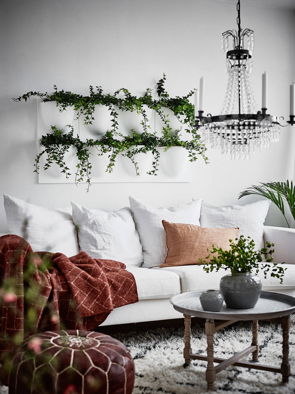 Les demi-pots à accrocher sont une alternative astucieuse quand il n’est pas question de faire un mur végétal dans son intérieur. Rassemblés en formations de huit et ornés de la même variété de plante, ils donnent l’impression de ne former qu’une seule et même œuvre d’art pour décorer le dessus du canapé de ce salon suédois.