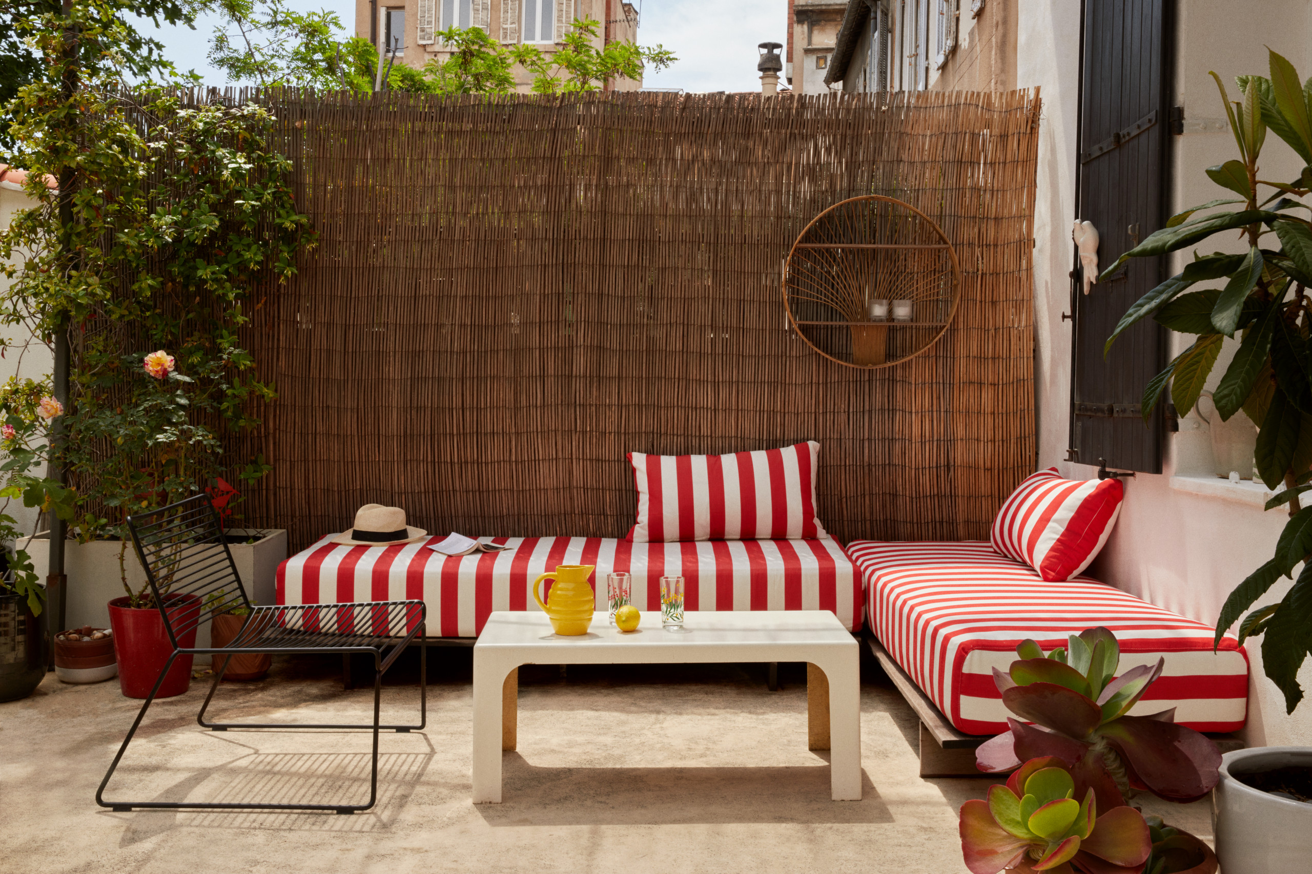 Pour une terrasse chic et détente. En rouge et blanc, les rayures créent une ambiance bord de mer chic sur cette terrasse marseillaise, rénovée par l’agence Mars Avril. Fabriquées avec un stock de lames de teck bradé et habillées avec des coussins réalisés sur mesure avec un tissu déperlant, les banquettes apportent de la couleur à cet extérieur.