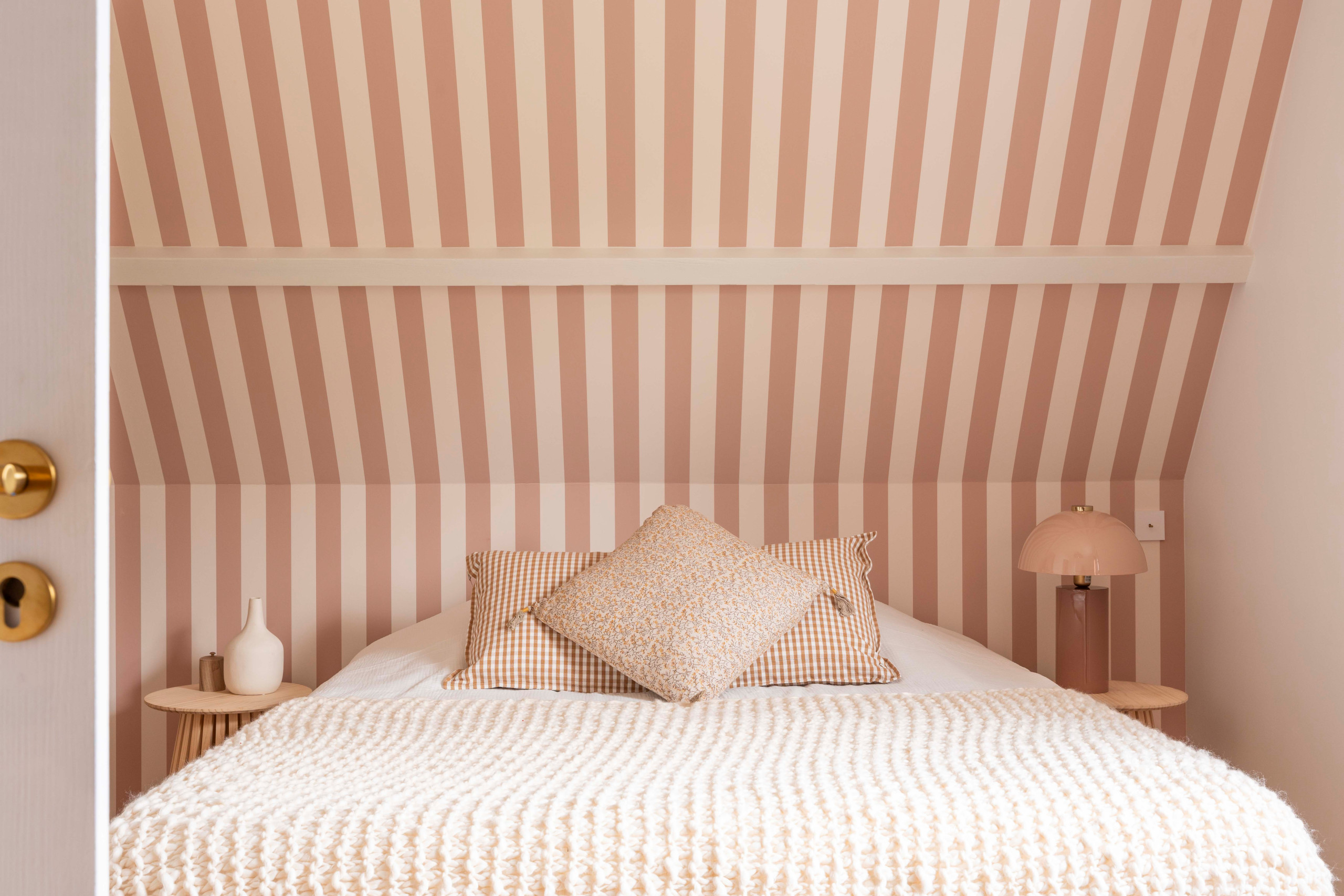 Pour faire oublier l’inclinaison. À l’étage de cette maison de campagne, l’architecte d’intérieur Adeline Pithois-Guillou a osé un parti pris fort : de larges rayures roses pour décorer l’une des chambres. La douceur de la teinte atténue le motif et l’ensemble masque l’inclinaison du toit, sous lequel est nichée la tête de lit. Le détail des lames de bois au niveau des tables de chevet complète parfaitement cette déco.