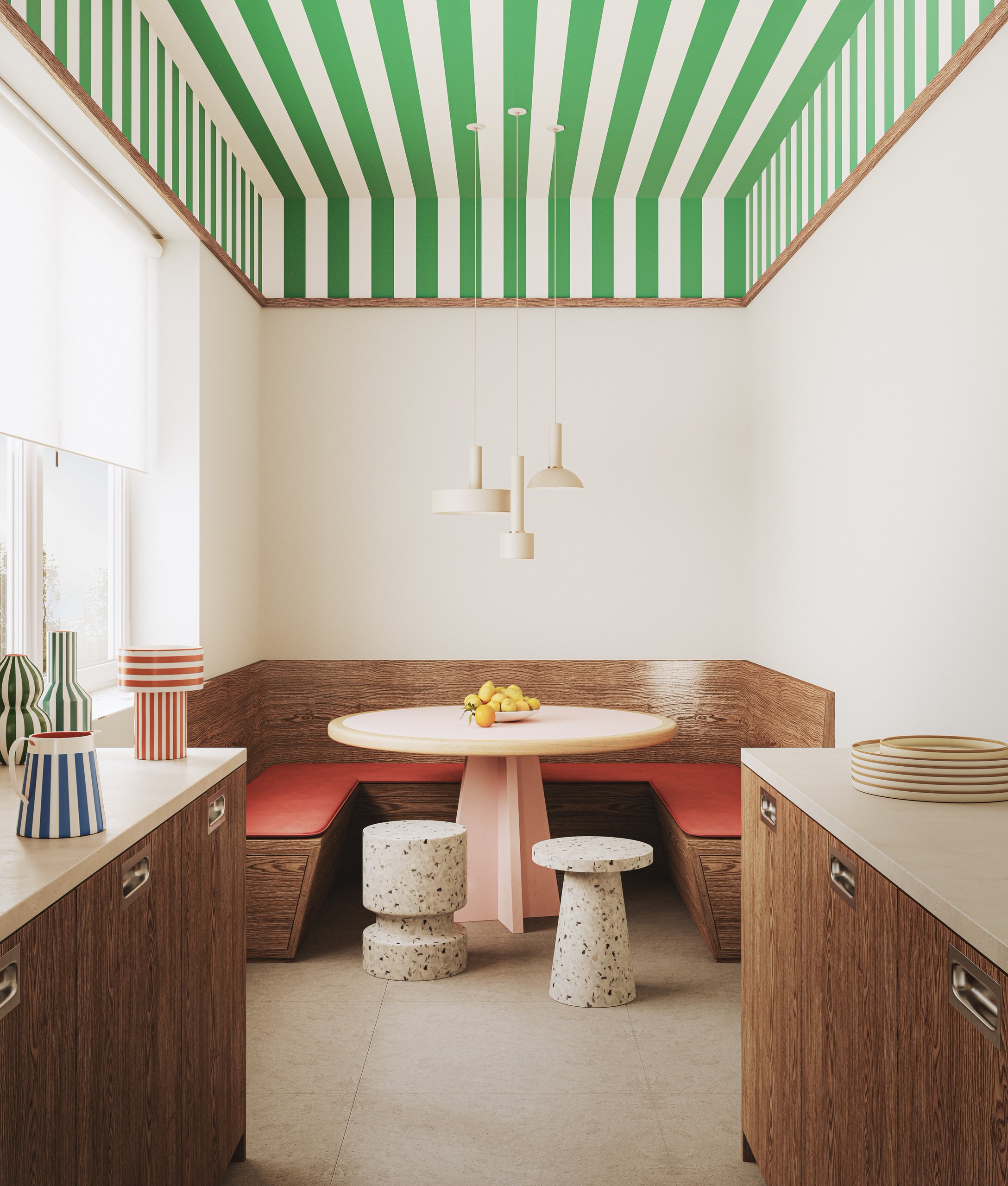 Pour un plafond sous le soleil. Installé sur le coin repas de cette cuisine, on se croirait presque en bord de mer, à l’abri du soleil sous le store banne d’un restaurant de fruits de mer. L’effet visuel des rayures vertes est saisissant et rend cette cuisine boisée unique, en lui apportant une touche de couleur rafraîchissante. Notez le détail des céramiques à rayures disposées sur le plan de travail.