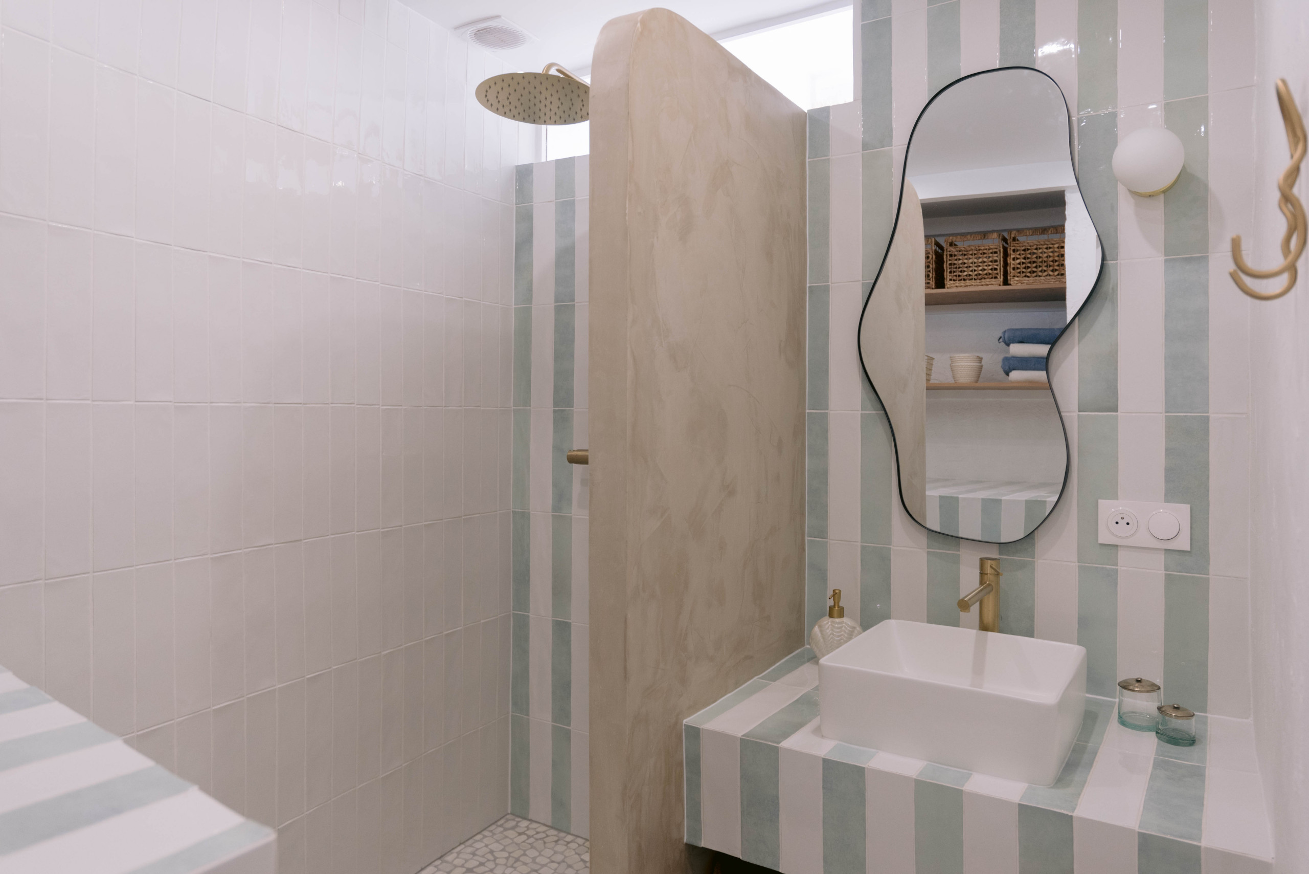 À la verticale dans la salle de bains. Dans ce même projet, l’idée des rayures en zelliges a été reprise dans la salle de bains pour recouvrir les murs et meubles du sol au plafond. En plus de créer une cohérence dans la décoration de l’appartement, elles permettent d’étirer visuellement la petite pièce en hauteur et ainsi d’augmenter la sensation d’espace.