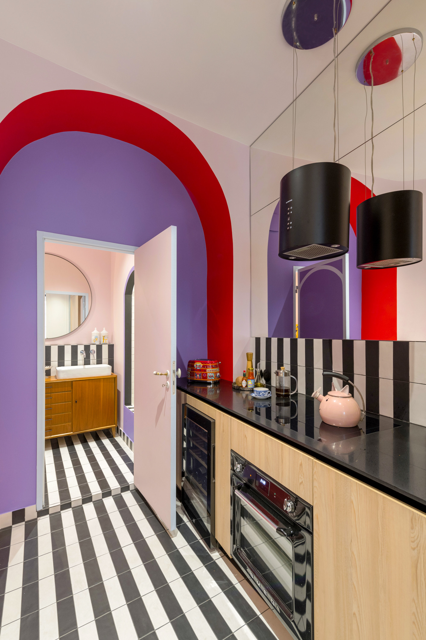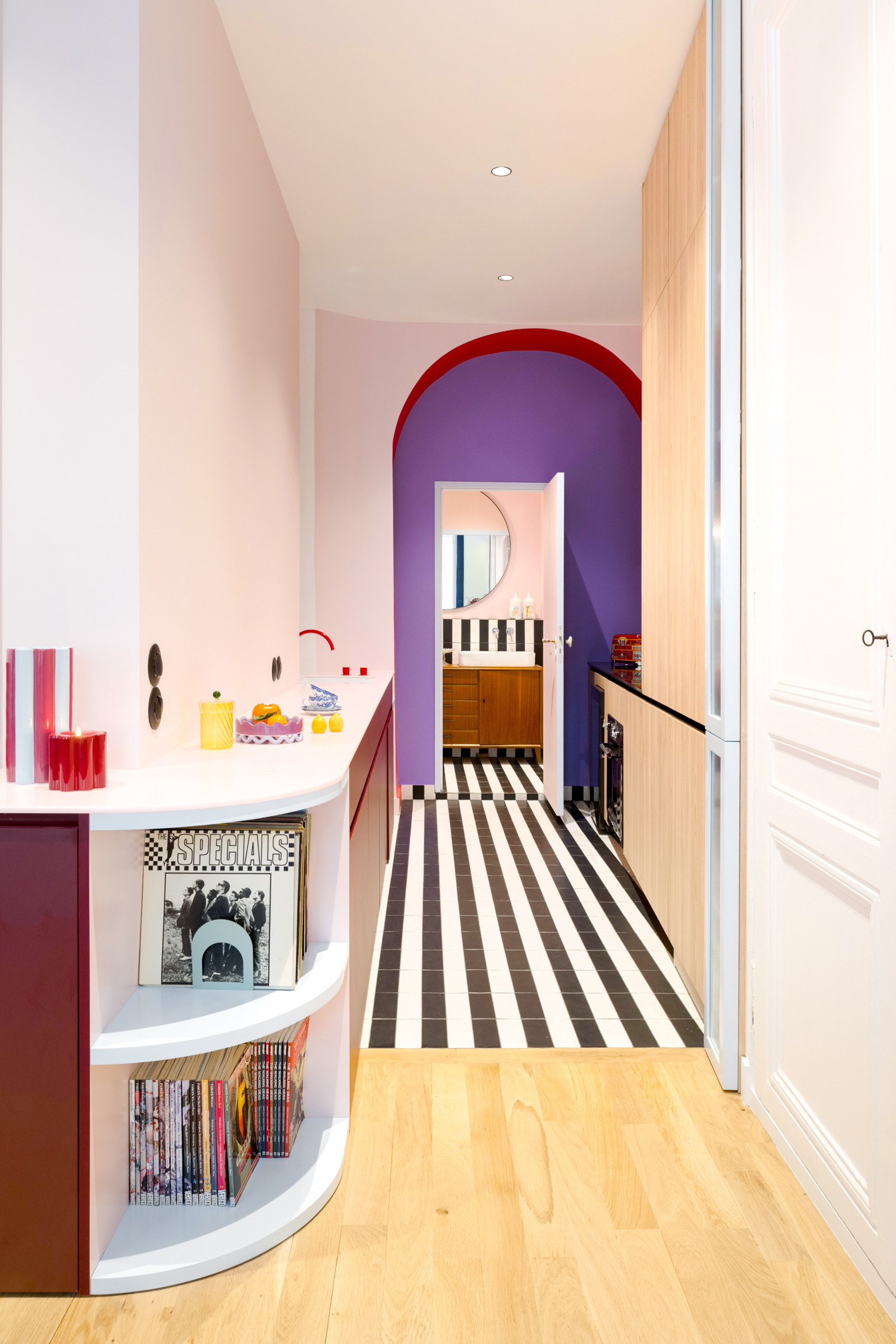 Pour faire disparaître les frontières entre les pièces. Impressionnantes d’audace, la cuisine et la salle de bains de cet appartement lyonnais rénové par l’agence d’architecture intérieure craie craie jouent avec les formes et les couleurs. Un carrelage à rayures noires et blanches fait le lien entre les deux pièces d’eau et le motif remonte sur les murs au niveau des crédences et de la douche.