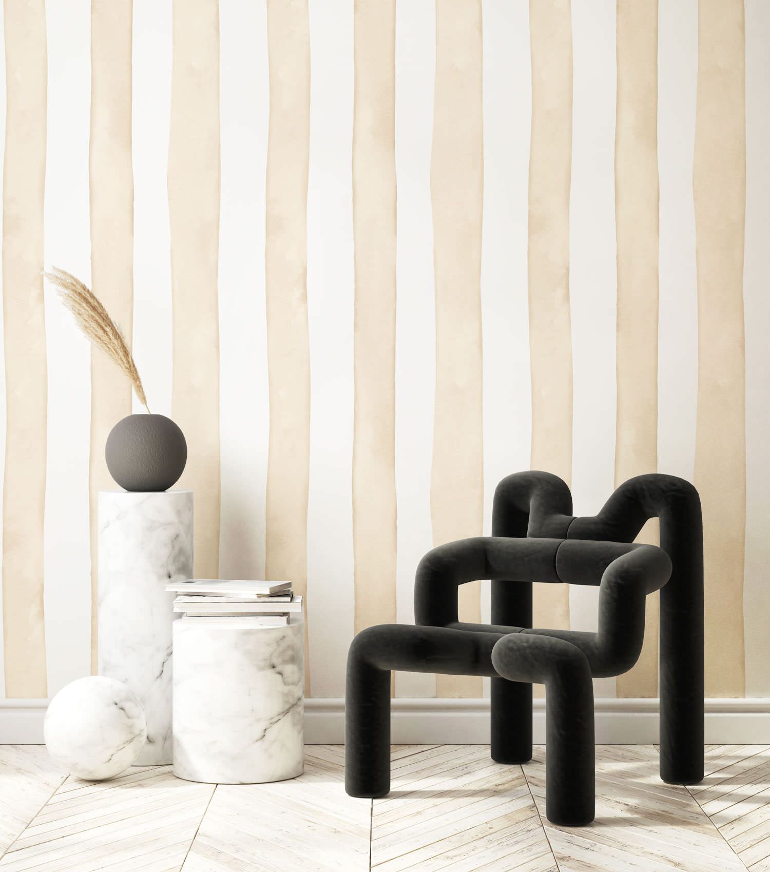 Comme un coup de pinceau. Papermint avait déjà lancé sa collection de papiers peints aux motifs rayures il y a quelques saisons. Avec leurs lignes irrégulières faisant penser à des bandes dessinées au pinceau ou au rouleau, ces rayures animent facilement les murs d’une pièce. En beige, elles répondent très bien aux envies de neutralité que nous constatons dans les intérieurs sans pour autant créer des décorations ennuyeuses.