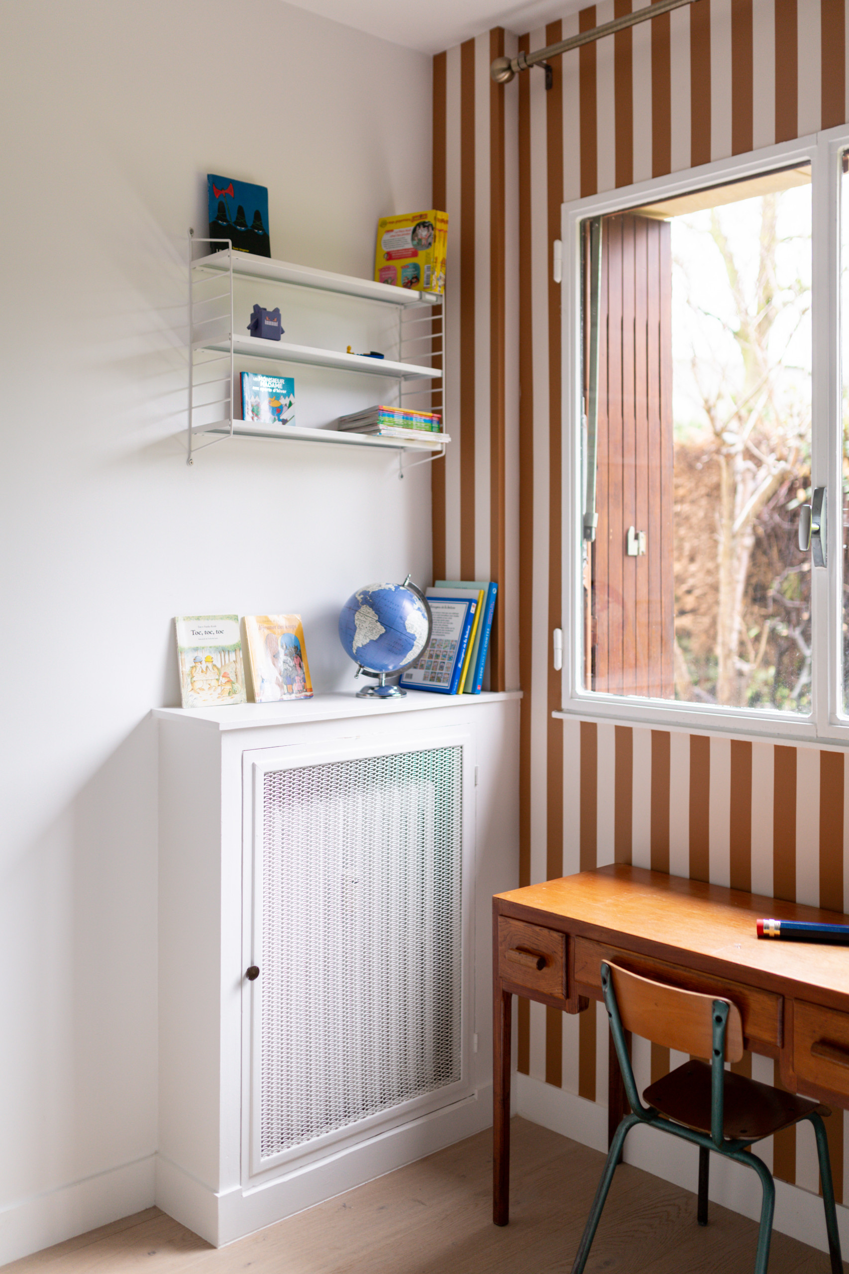 Pour délimiter un coin bureau. Dans ce projet de rénovation d’un rez-de-jardin familial orchestré par l’agence Ouvrage, les architectes d’intérieur ont eu l’idée d’animer l’une des chambres d’enfant avec des rayures. Un papier peint très graphique sert alors à identifier visuellement le coin bureau du petit garçon, créant une toile de fond parfaite pour son bureau d’écolier chiné.