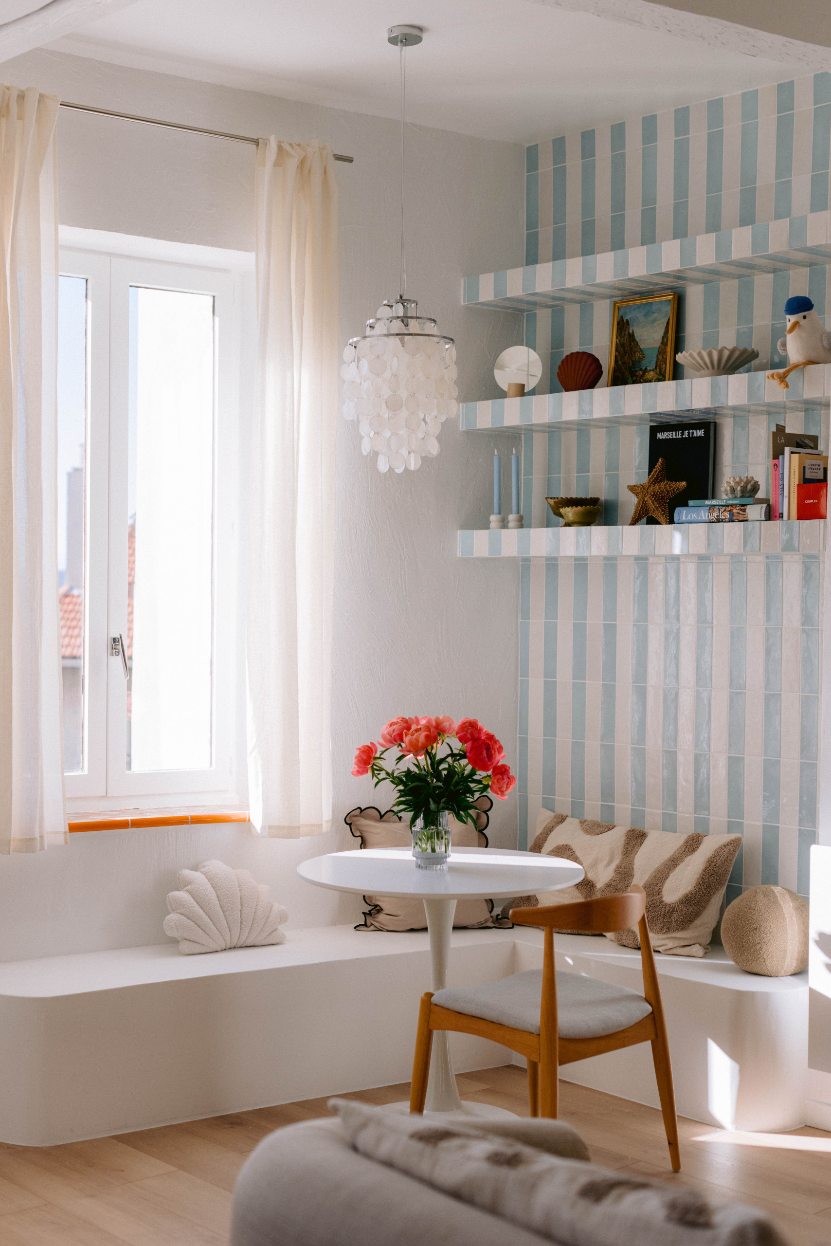 Entre ciel et mer. Ici, le coin repas prend des airs de bord de mer. Dans cet appartement marseillais, rénové par l’agence d’architecture intérieure Celeste Design Studio, le motif grosses rayures bleu ciel et blanches a été réalisé à l’aide de zelliges en aplat sur les murs. Il se retrouve ainsi modernisé avec des accents nacrés, qui ne sont pas sans rappeler les fonds marins.