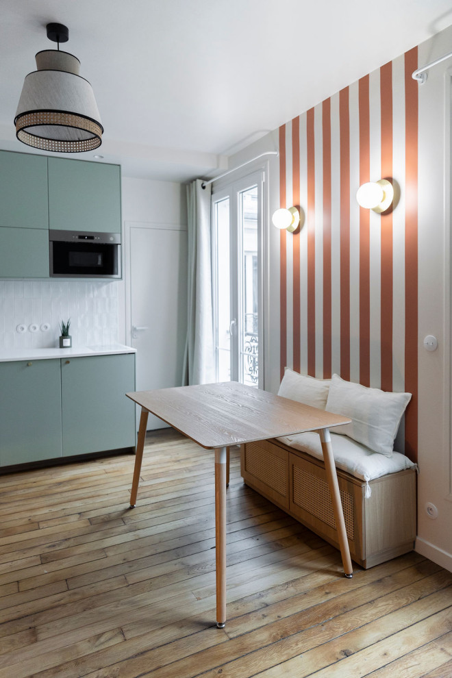 Pour identifier un espace. Nul besoin d’investir dans un papier peint ou dans du carrelage pour s’amuser avec les rayures en intérieur. Dans ce projet de studio rénové par l’agence Studio Prunel, par exemple, les rayures qui identifient le coin repas ont été calepinées sur mesure par les architectes d’intérieur et peintes par l’entreprise de travaux avec des fonds de pots de peinture terracotta. Une astuce tout aussi pratique qu’économique.