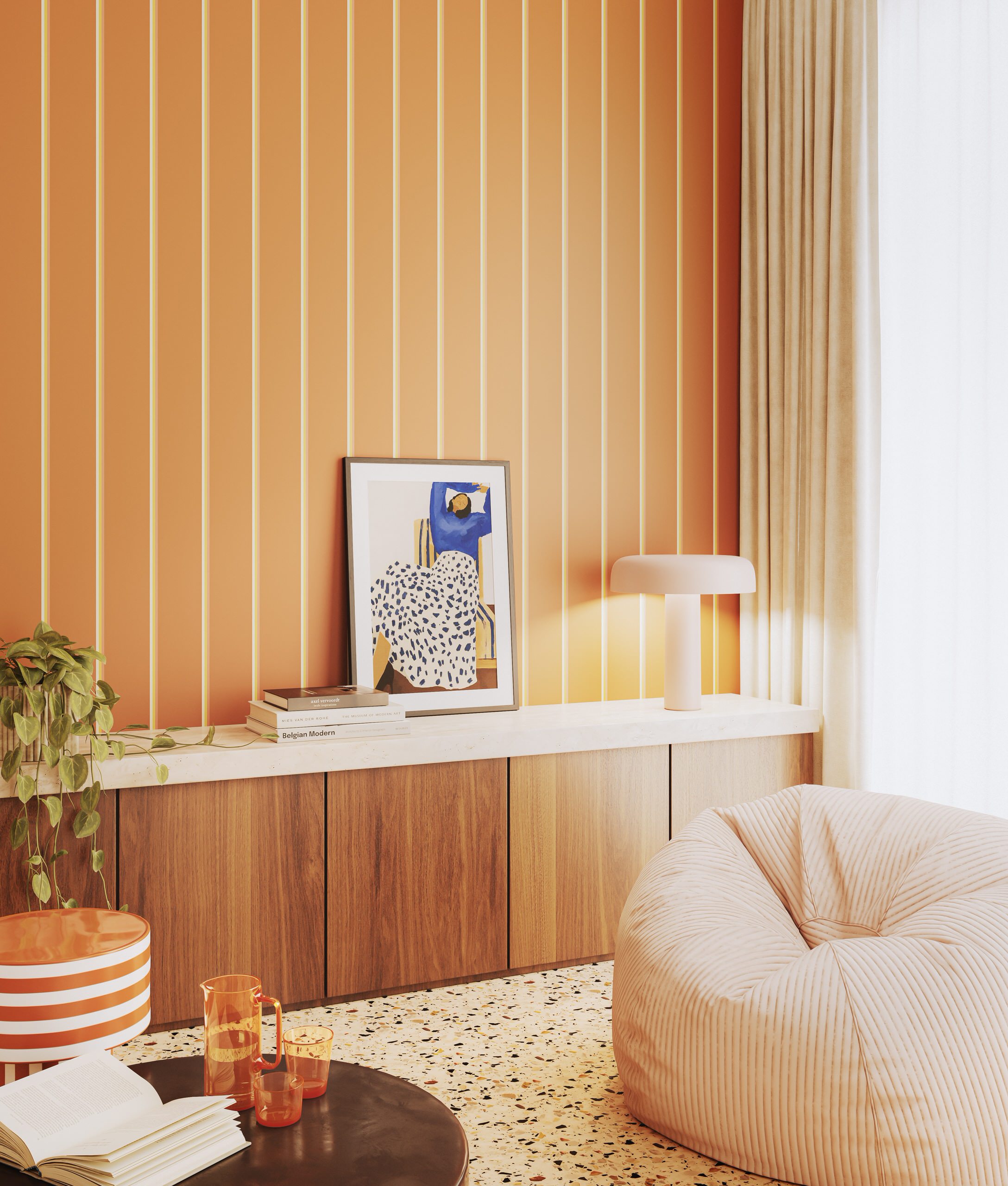 Notez sur cet autre visuel à quel point les rayures trompent notre regard pour faire disparaître les frontières entre les pièces. Le tout s’articule ainsi harmonieusement jusque dans le séjour, formant un ensemble cohérent et fonctionnel.
