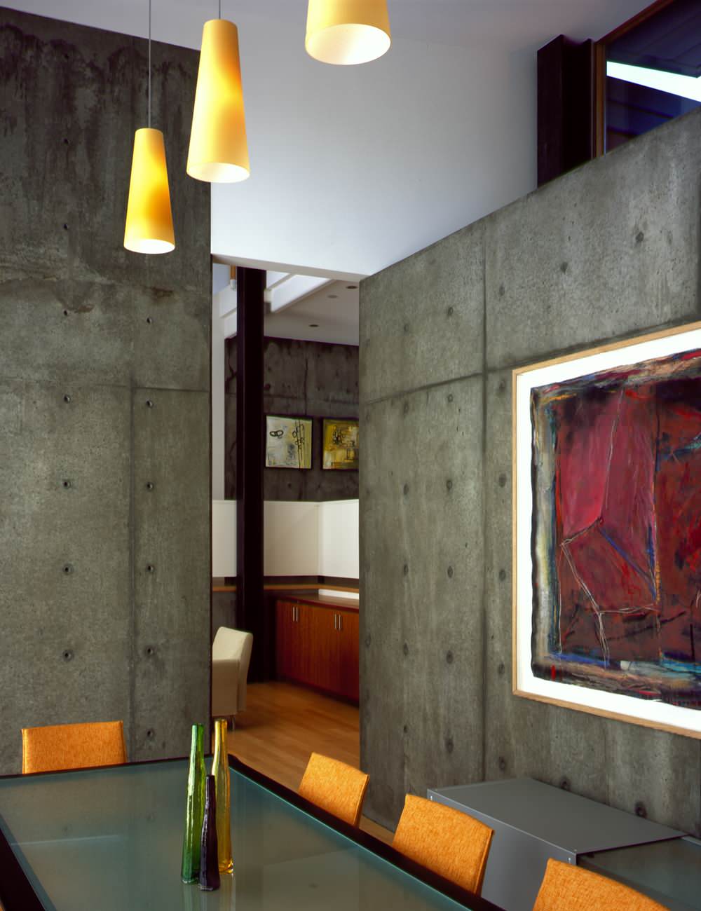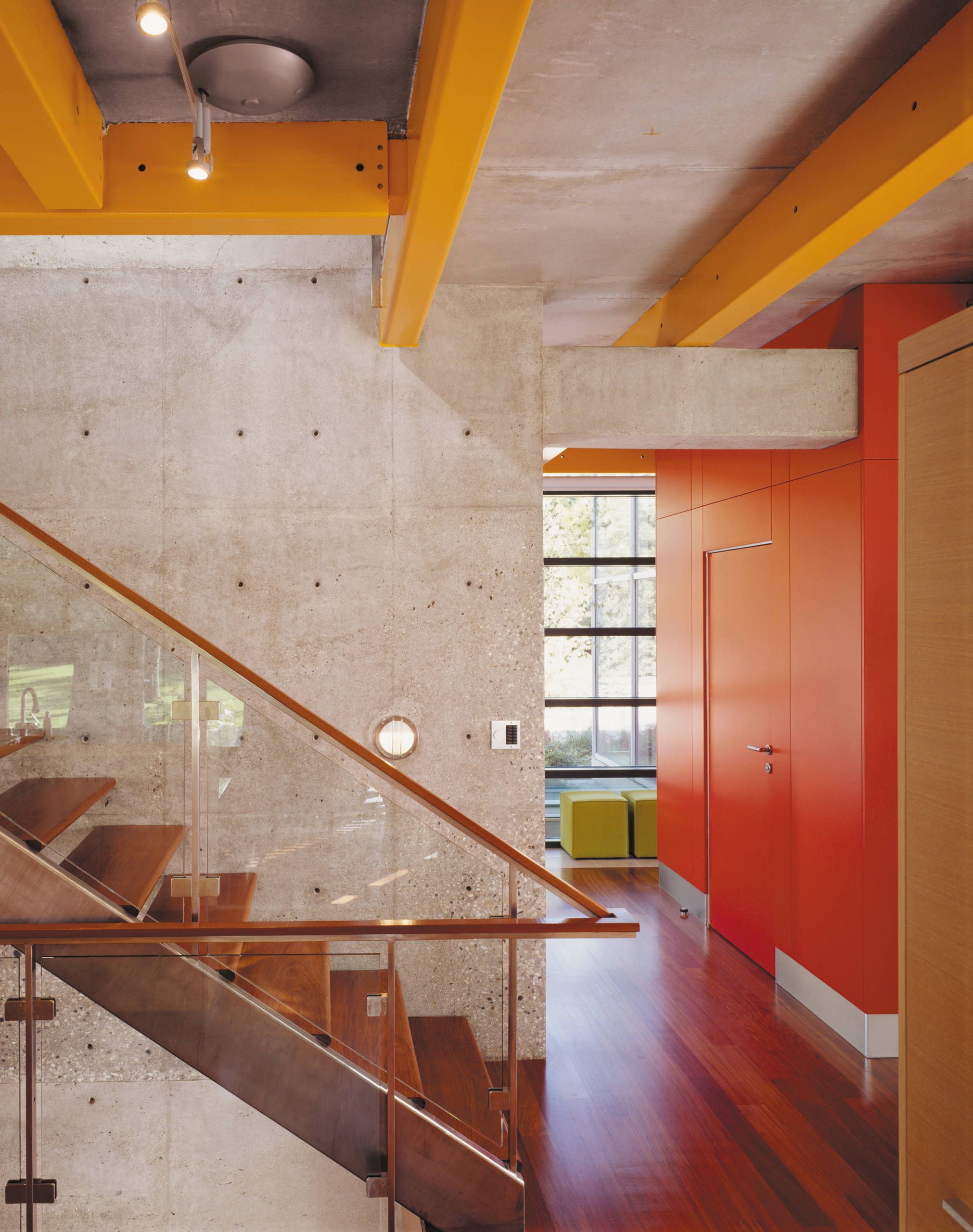 Ici, les impressionnantes poutres d’acier peintes en jaune et un plafond et des murs en béton coulé se complètent parfaitement.
