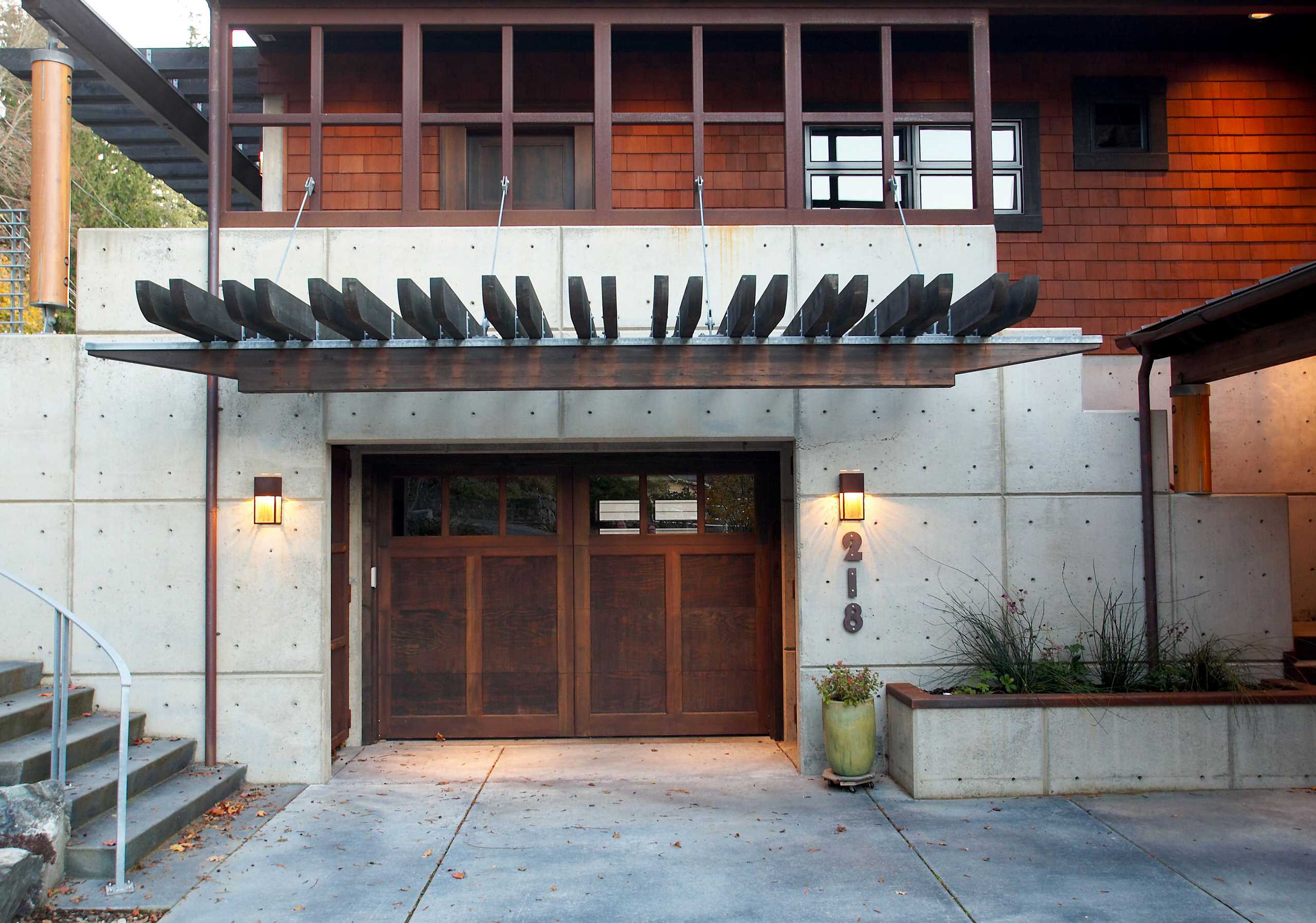 L’extérieur de cette maison contemporaine allie des bardeaux à du béton coulé.