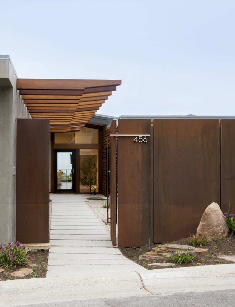 Les exemples précédents proposent et illustrent des usages extrêmes de l’acier Corten, mais la plupart des gens préfèrent employer ce matériau de manière plus sélective, sans couvrir les façades de rouille. Cette maison conçue par le cabinet d’architectes Laidlaw Schultz Architects limite l’utilisation de ce matériau à la clôture et au portail d’entrée. Il me semble d’ailleurs très bien pensé d’avoir choisi d’utiliser le même matériau à la fois pour la clôture et pour le portail. Le poids du panneau du portail et la force nécessaire pour l’ouvrir (je suppose que seules de très bonnes charnières rendent cette tâche possible) marquent très nettement la séparation entre la rue et l’espace privé de la propriété et de son jardin.
