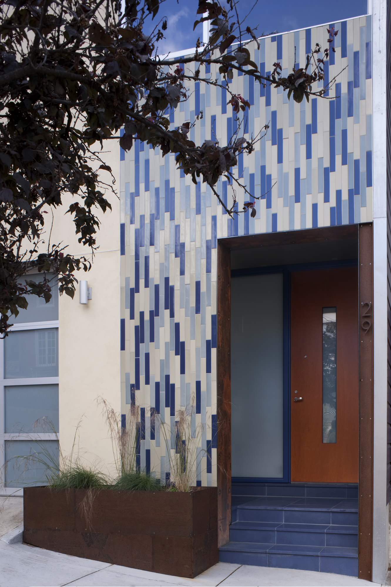 De manière plus subtile, l’acier Corten peut aussi prendre la forme d’une jardinière comme ici, devant la porte d’entrée de cette maison de ville. Dans le cas présent, l’aspect de rouille fait écho à la couleur de la porte et contraste harmonieusement avec le bleu (qui lui est opposé dans le spectre des couleurs) des marches et des divers carreaux de la façade.