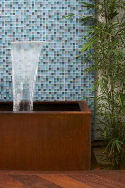 Dans cette fontaine, l’acier Corten complète encore une fois des carreaux bleus. Il semble vraiment y avoir quelque chose entre le orange de la rouille et le bleu qui fait que ces deux couleurs s’accordent si bien. Ici, le minimalisme de la fontaine, une simple fente horizontale dans le mur, se retrouve dans bassin. L’utilisation d’un autre matériau (comme le bois de la terrasse) aurait ajouté trop de détails et nui au style de l’ensemble, ce qui n’est absolument pas le cas avec l’acier.