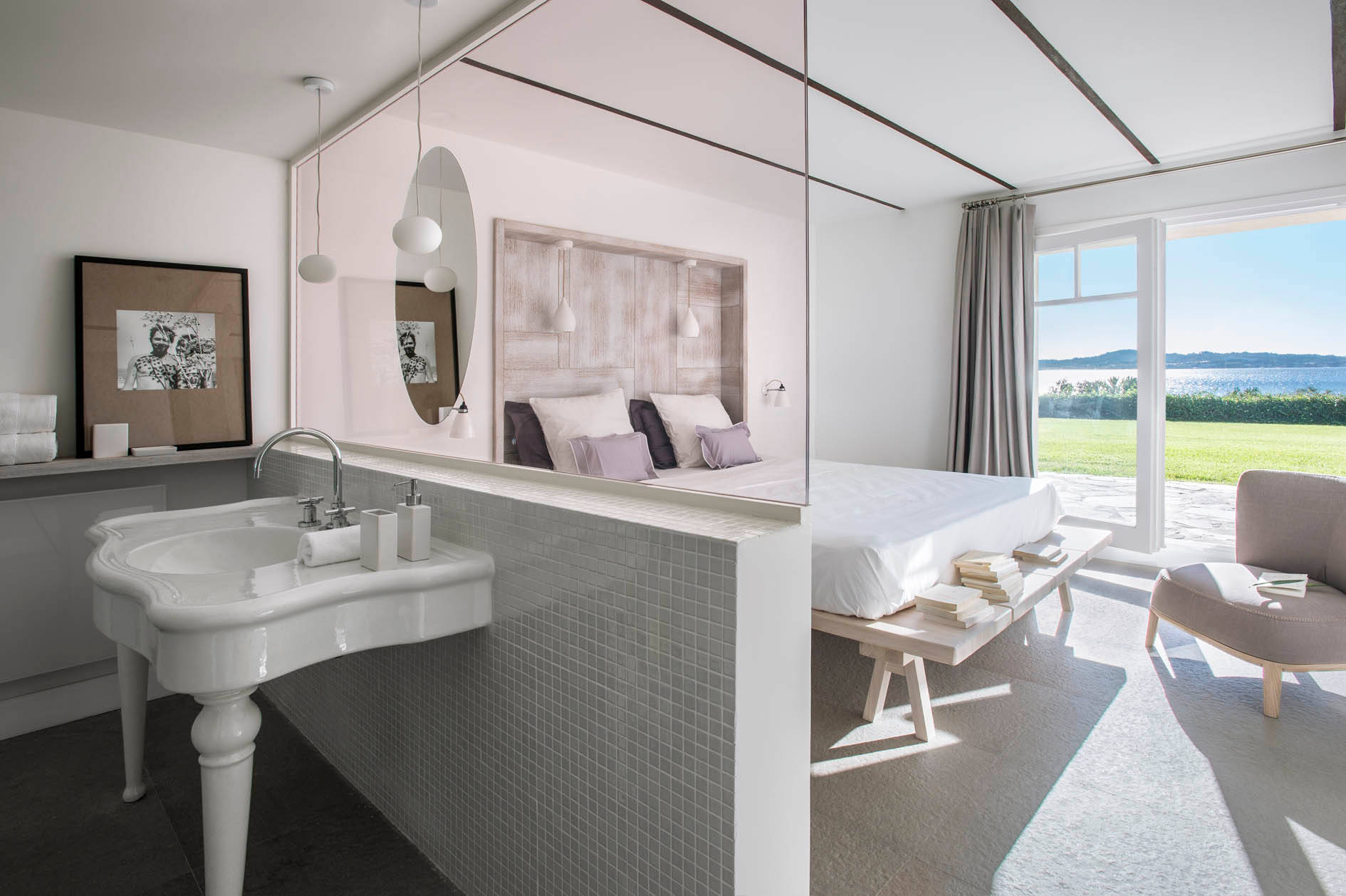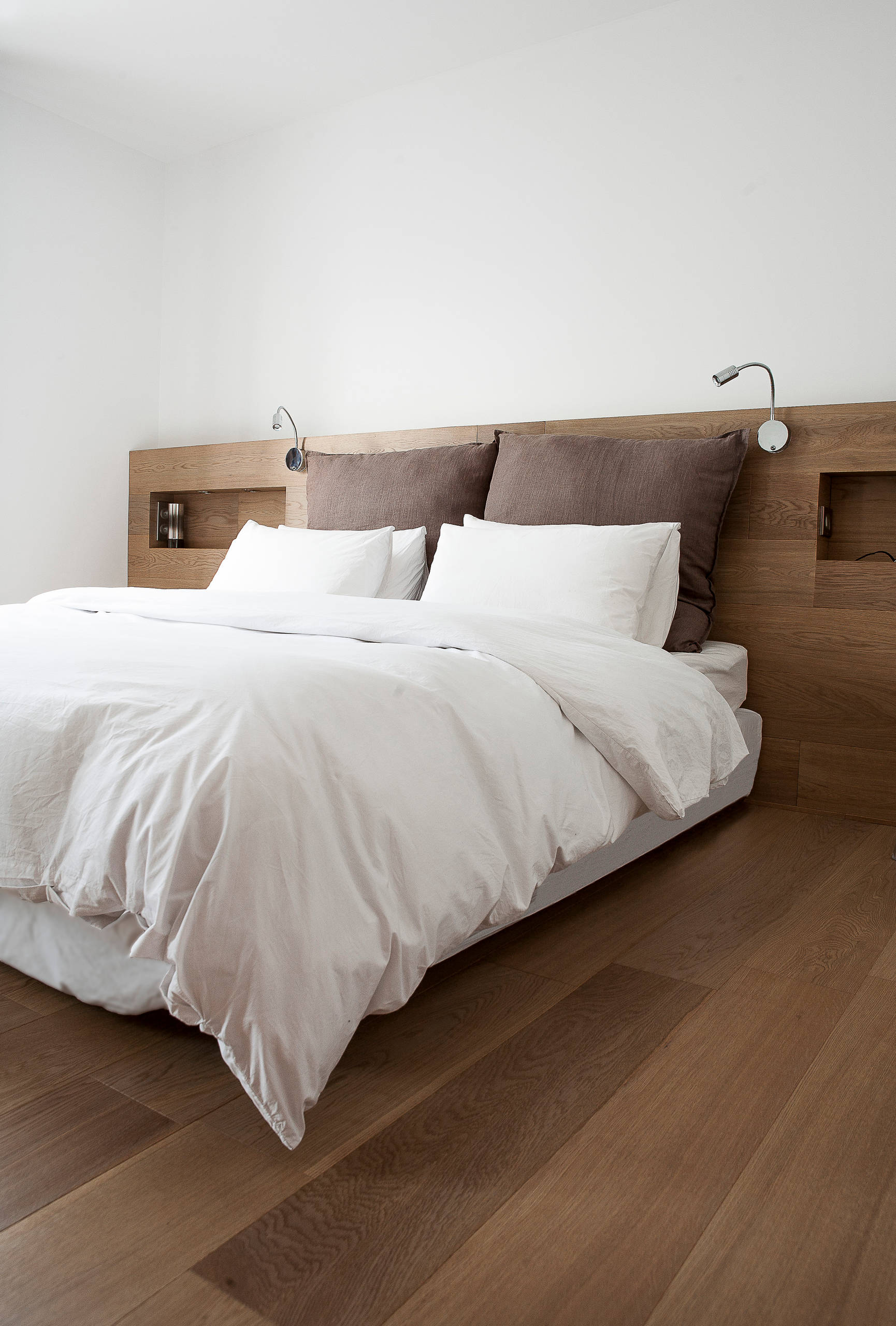 Astuce : En habillant la tête de lit et le sol dans la même finition, on va effacer les limites de l’espace. On ne distingue plus ce qui est vertical de ce qui est horizontal. La pièce prend alors de nouvelles proportions.