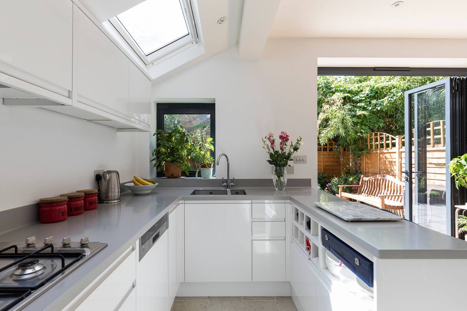 Les placards de cette cuisine, conçue par Vorbild Architecture, ont une surface brillante qui réfléchit la lumière dans la pièce. C’est particulièrement efficace ici, car le puits de lumière, la porte vitrée et la fenêtre apportent beaucoup de clarté dans la pièce, et les surfaces des placards contribuent à la mettre en valeur.