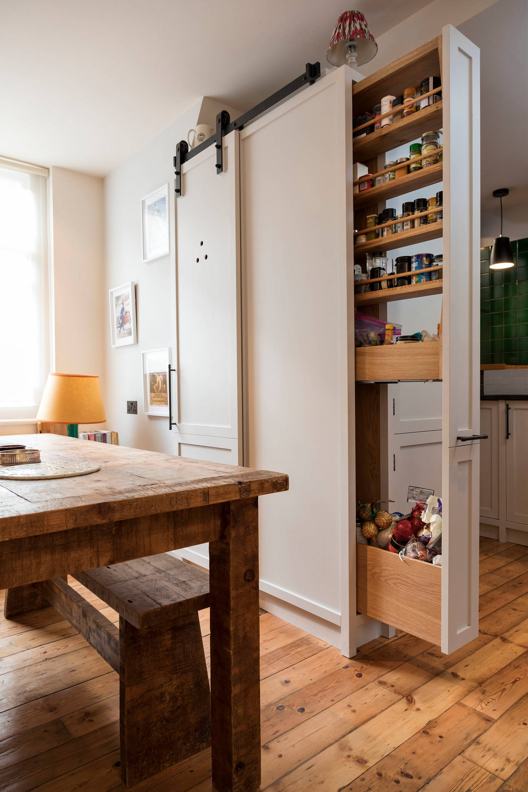 Une idée comme ce meuble coulissant dans une cuisine conçue par Murray & Ball Furniture en est un excellent exemple. Les concepteurs ont tiré le meilleur parti d’un espace étroit sur le côté de l’armoire principale pour y insérer un meuble très utile où les propriétaires peuvent ranger leurs épices et leurs légumes.
